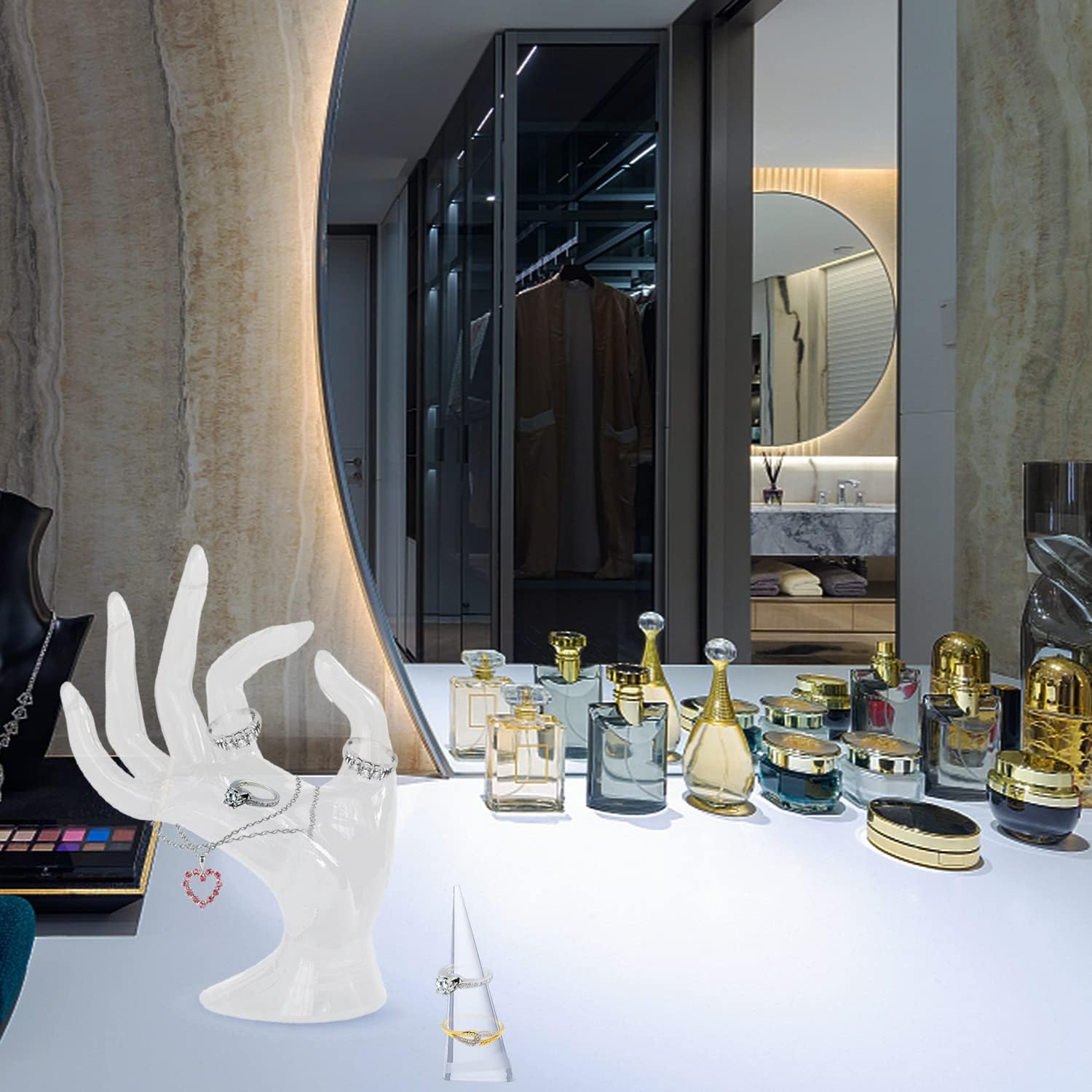 👌Suitable Occasions: This White Transparent ring holder is designed with full of Feminine taste, you can place them in stores, jewelry shop, home, bedroom, living room, etc., which will help you to organize your jewelry.which can improve your jewelry taste,make your rings necklace Bracelets Watchs looks nobler.