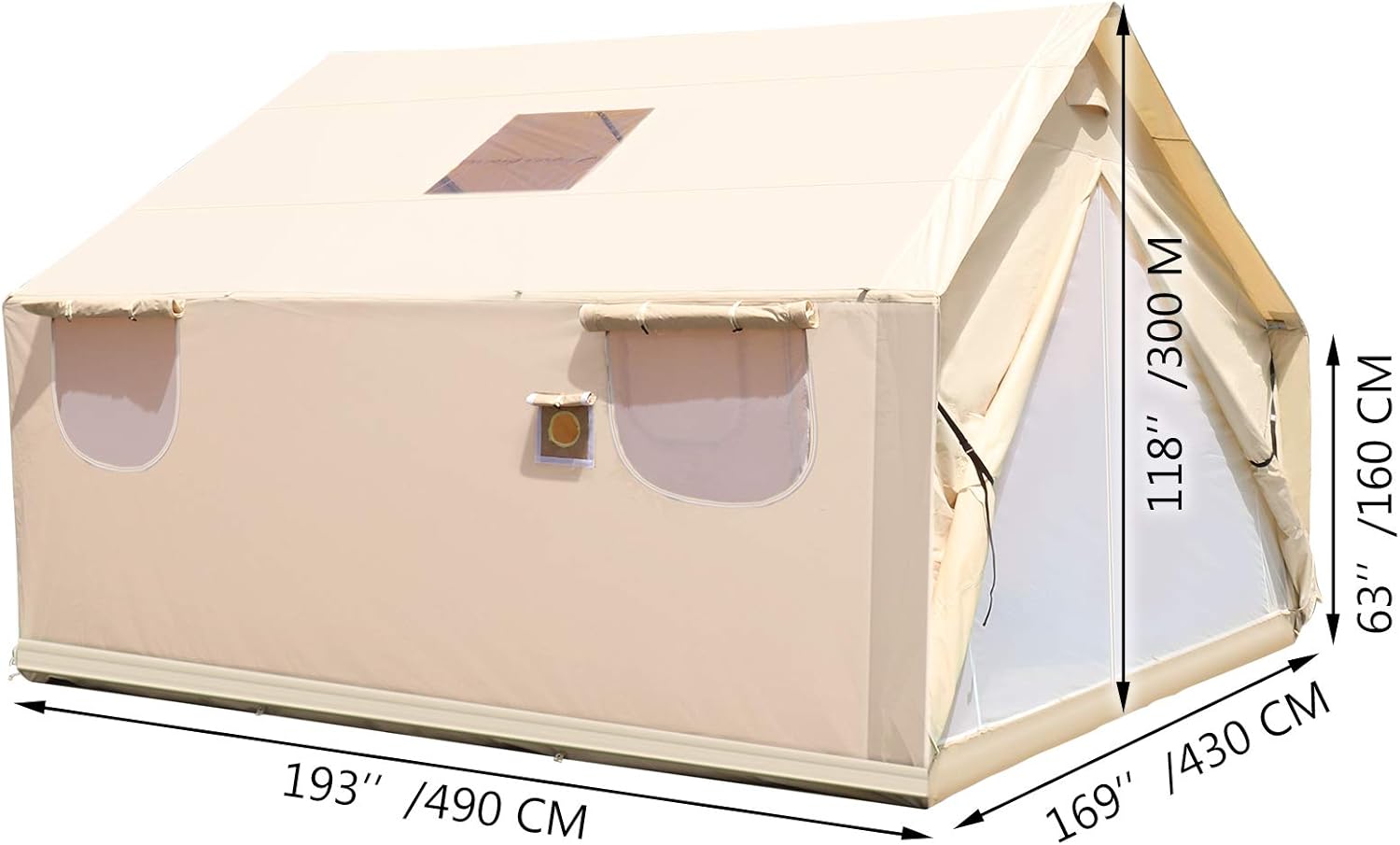 The outfitter tent boasts large rectangle distinctive windows, a top dormer with PVC storm flap, two vents on the front and back and two stove holes for safe cooking and heating.