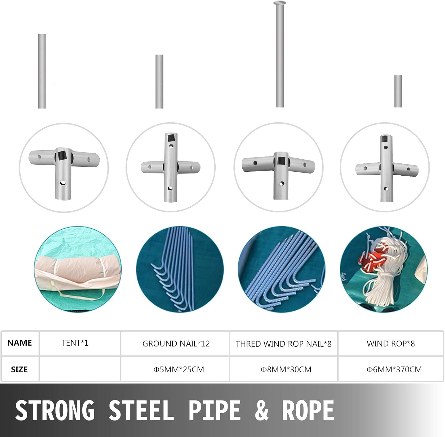 The tent has strong steel center poles, galvanized frame tubes, tight nylon rope, wind rope nails that tough enough to withstand 40+mph wind, rain or even snow.