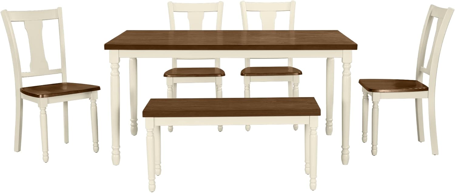 Harper & Bright Designs Classic 6 Piece Kitchen Dining Table Set, Wooden Rectangular Table with 4 Chairs and 1 Bench for Kitchen Dining Room, Home Furniture (Brown+Cottage White)