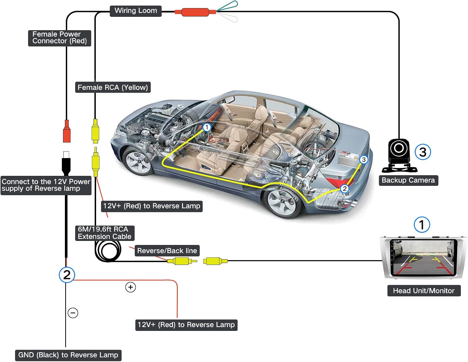 Step 3: Connect the camera’s RCA cable to the unit in your vehicle. Wire camera’s red line to reverse line of unit.