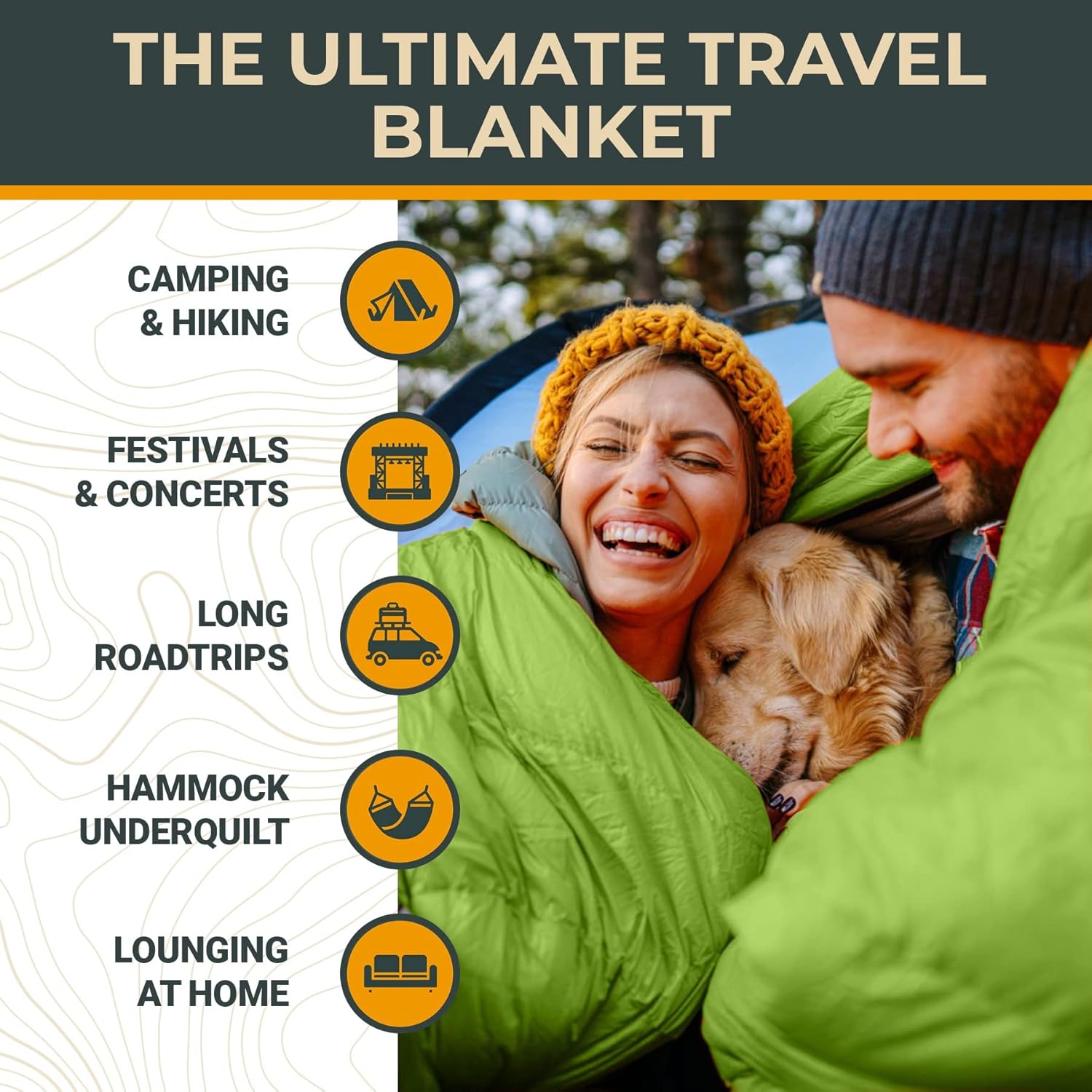 ULTRALIGHT PACKABLE BLANKET – This puffer blanket weighs 18oz, measures 76 inches x 54 inches long, and comes in a 5 inches x 12 inches carry bag for easy travel. The perfect camp blanket, top quilt, or down throw for a stadium, music festivals, the beach, or a hammock.