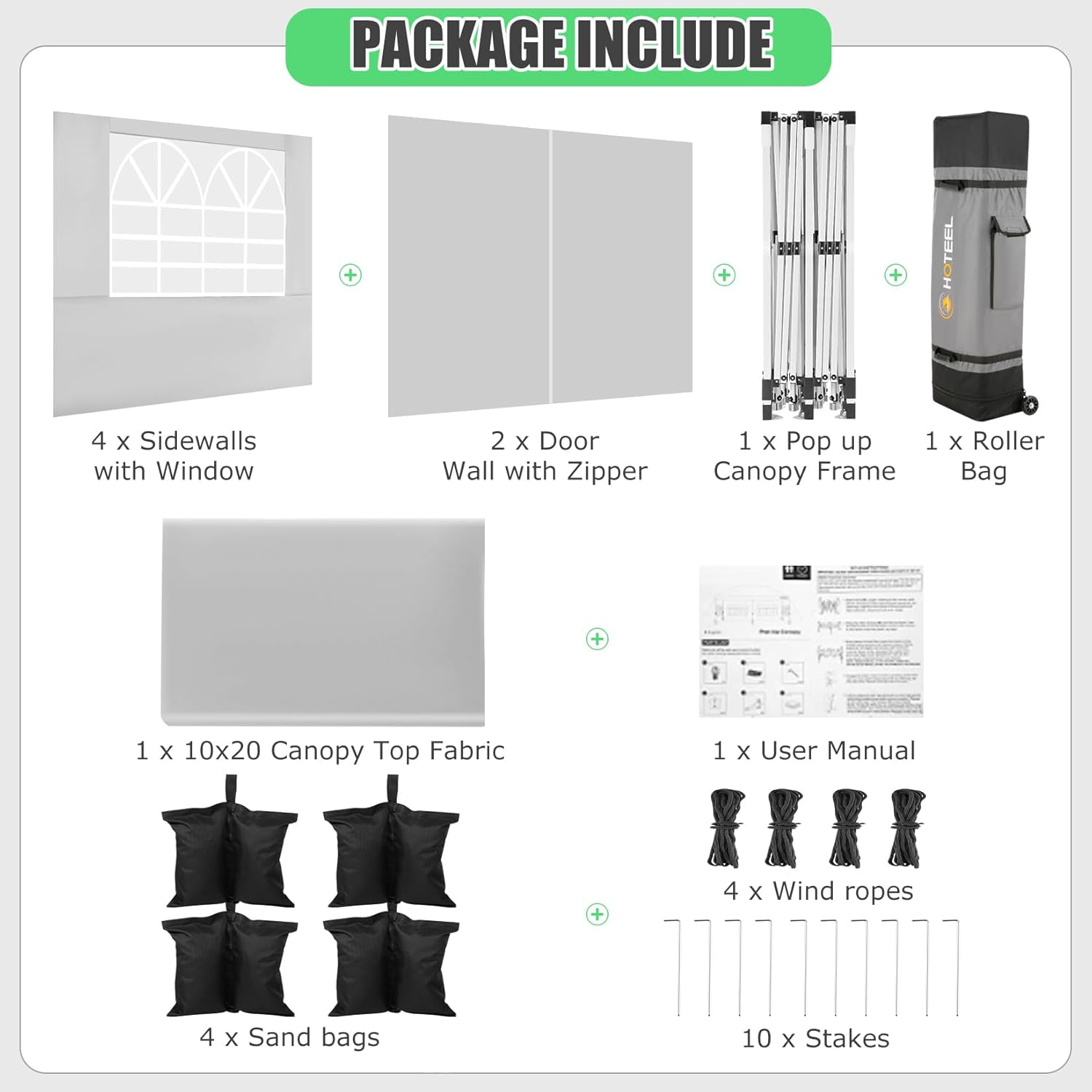 【Removable Sidewalls & Warranty】 HOTEEL 10×20 canopy with sidewalls is equipped with 4 transparent church window sidewalls and 2 zipper doors, you can hang the sidewalls as you need. If there any issue with it, please don’t hesitate to contact us. We will reply to you within 24 hours.