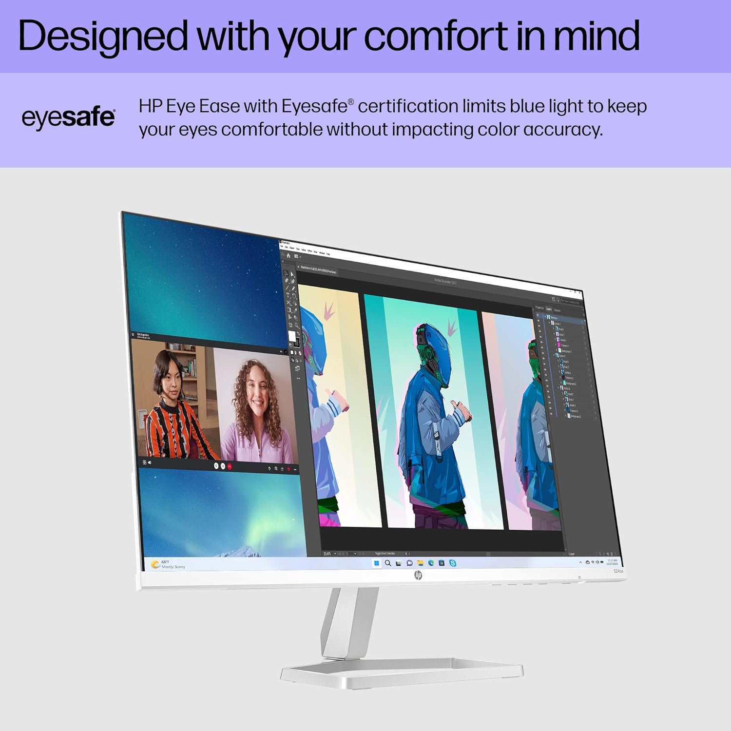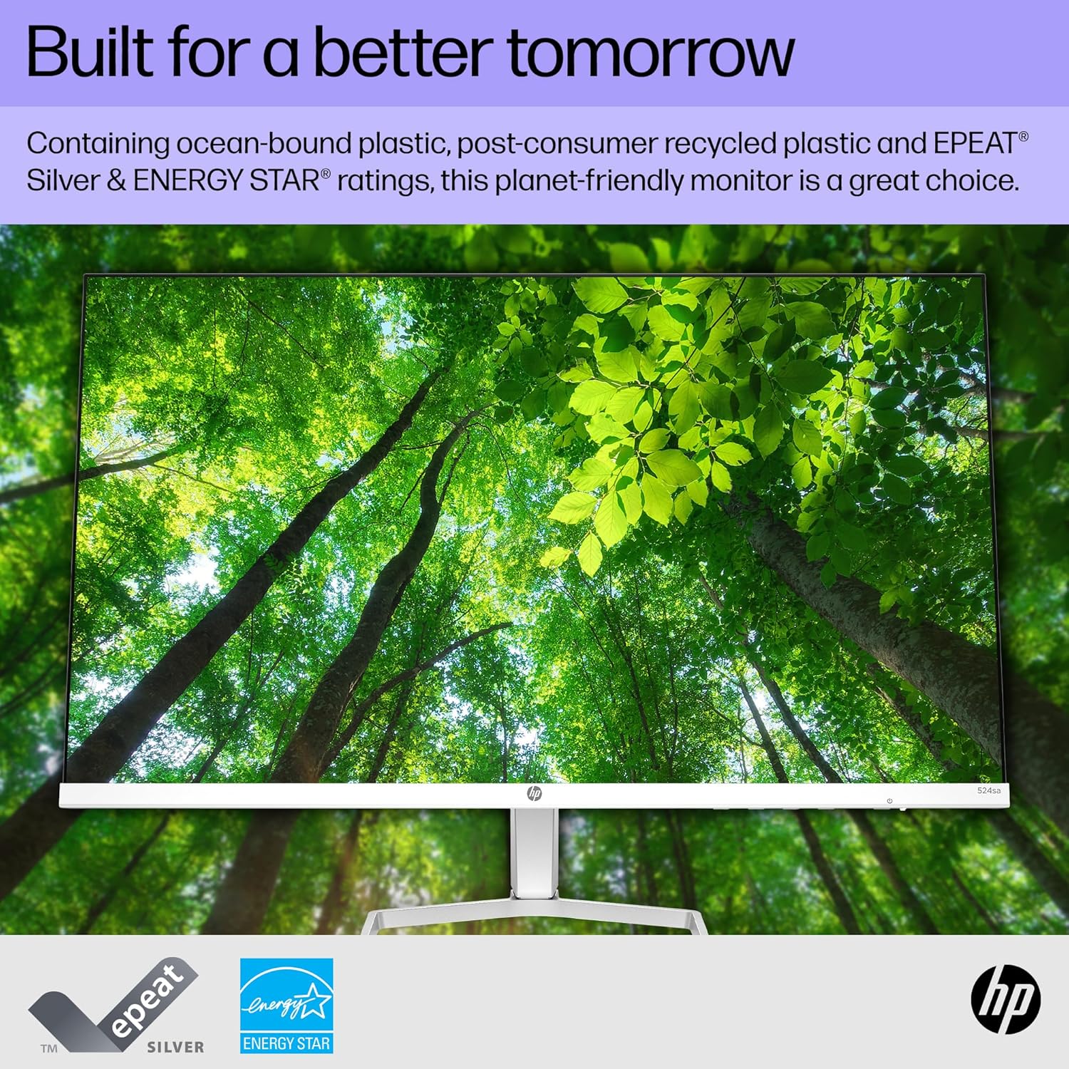 Sit back and soak in all the content you love with this exceptional 23.8″ FHD monitor with speakers. Experience colorful imagery and vibrant detail like they were intended with 99% sRGB color, deep 1500:1 contrast ratio, and 300 nits brightness. Its 100 Hz refresh rate delivers seamless scrolling and smooth, stutter-free viewing. With a tilt adjust stand and the Ergonomic Setup Guide in HP Display Center you can customize your comfort. Plus, HP Eye Ease with Eyesafe certification limits blue light to keep your eyes comfortable without impacting color accuracy, so you can do more, longer. These HP Series 5 monitors are designed using 85% recycled materials and 5% ocean-bound plastics to help reduce the raw materials we use. With 100% sustainably sourced packaging and an EPEAT Silver Registered and ENERGY STAR Certified design, you can be confident knowing you have a monitor that does good things for the planet while doing amazing things for you. This monitor is protected by a 1-year HP limited warranty. Certain restrictions and exclusions apply. ENERGY STAR and the ENERGY STAR mark are registered trademarks owned by the U.S. Environmental Protection Agency. Based on U.S. EPEAT registration according to IEEE 1680.1-2018 EPEAT. EPEAT status varies by country. Visit www.epeat.net for more information.