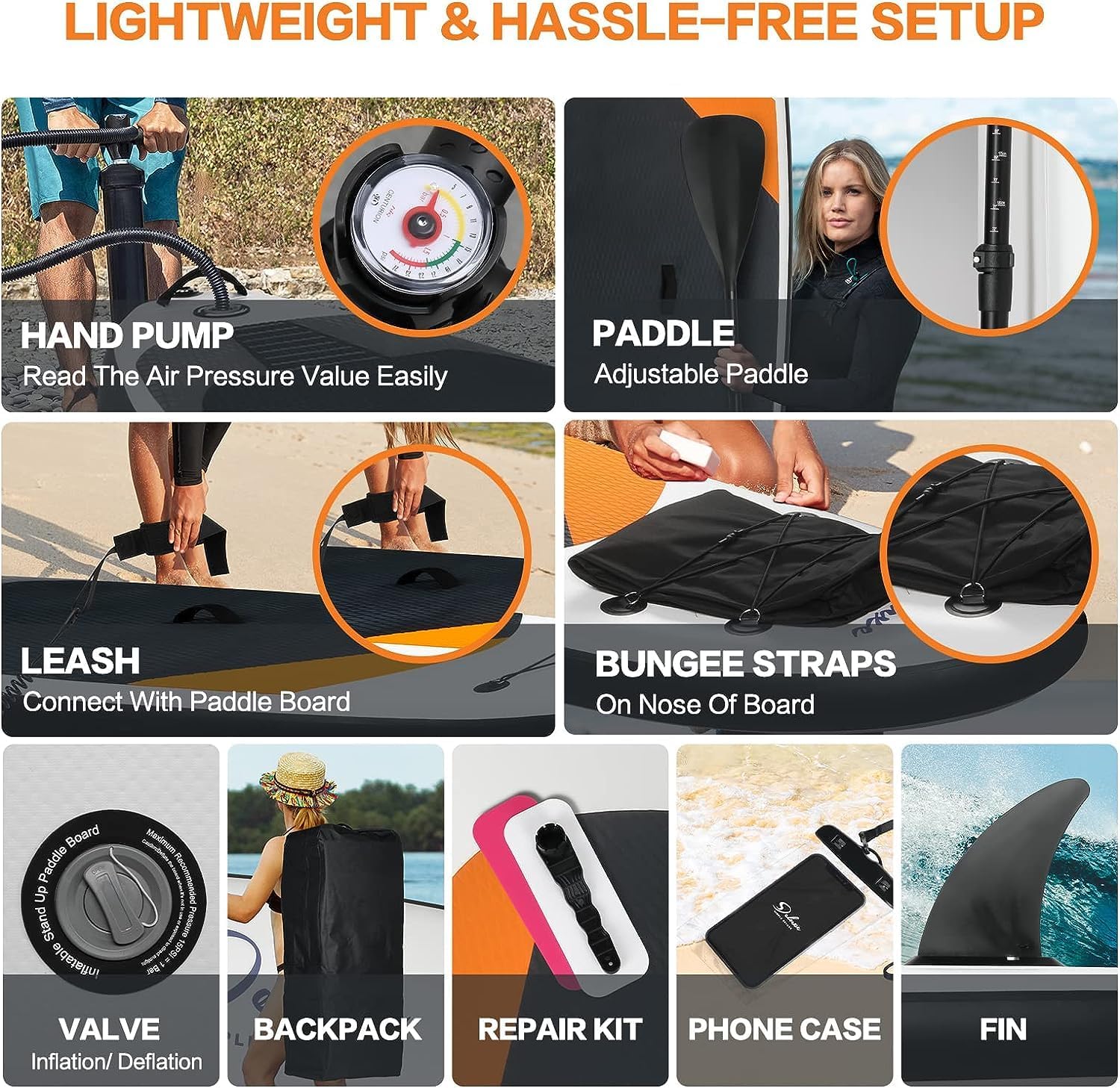 [ALL-IN-1 ACCESSORIES] The Package Includes: 1*inflatable paddle board, 3-piece length adjustable floating paddle ,1* removable fin, 1*SUP hand pump, 1*backpack, 1*leash,1* paddle hanger If you come across any high pressure valve or fin mounting issue, please refer to our instructions in the images, thanks.