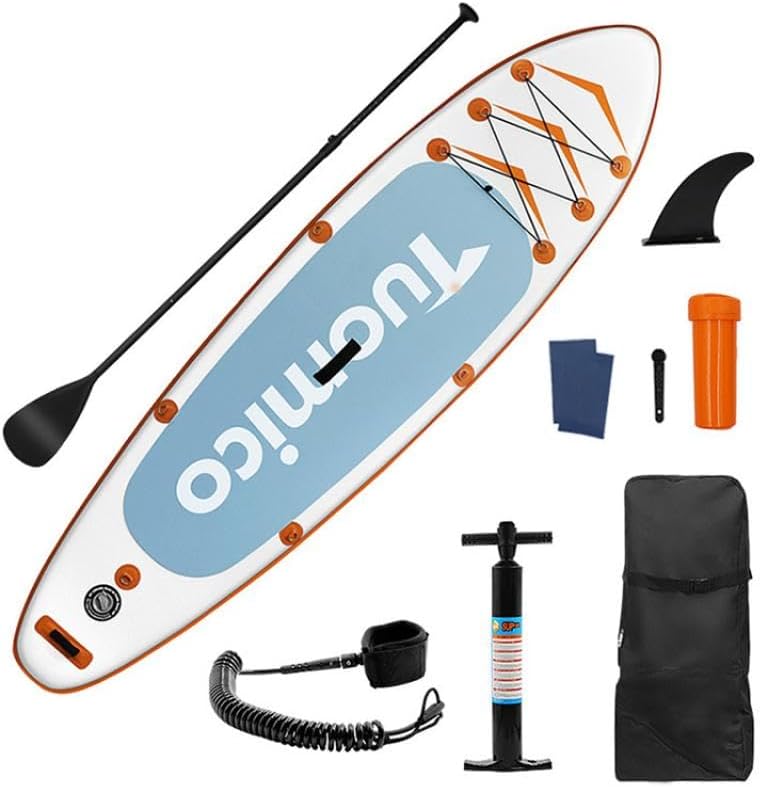 【PACKAGE INCLUDES】Package includes inflatable paddle board, adjustable paddle blades, removable center fin, manual air pump with air pressure gauge, storage backpack, SUP leash and repair kit.