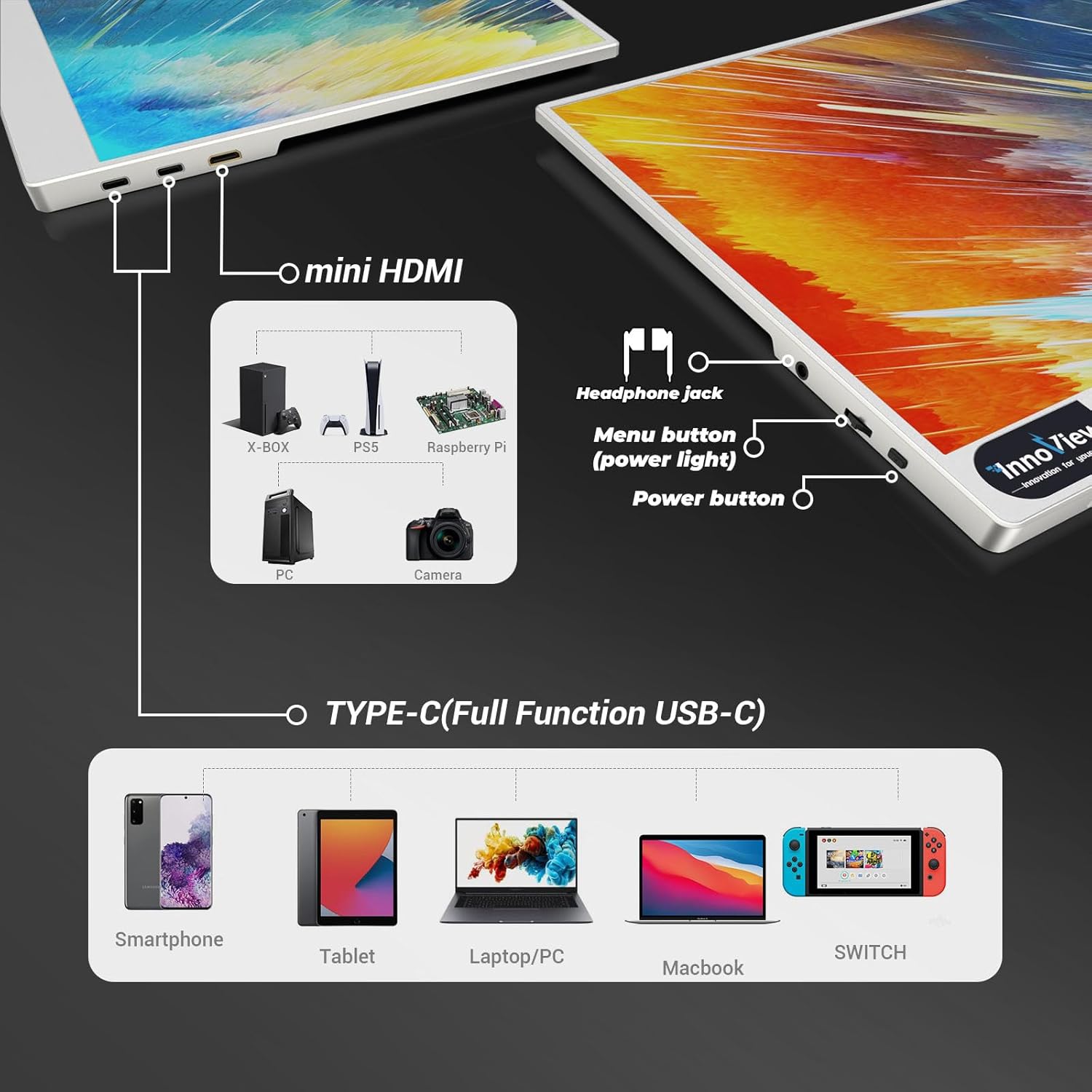 ✨𝙐𝙡𝙩𝙧𝙖-𝙏𝙝𝙞𝙣 𝙏𝙧𝙖𝙫𝙚𝙡 𝙈𝙤𝙣𝙞𝙩𝙤𝙧: InnoView usb c monitor for laptop with powerful smart cover doubles as a stand, the monitor is silver (not white), only 4mm(0.2 inches) at the slimmest point and 2.65 lbs weight, it fits easily into a backpack during a business trip, travel, or anywhere. They are true portable monitors ideal for home office, emergency meetings, entertainment, and travel. Unfold the screen anytime, anywhere, improve work efficiency and improve the quality of life