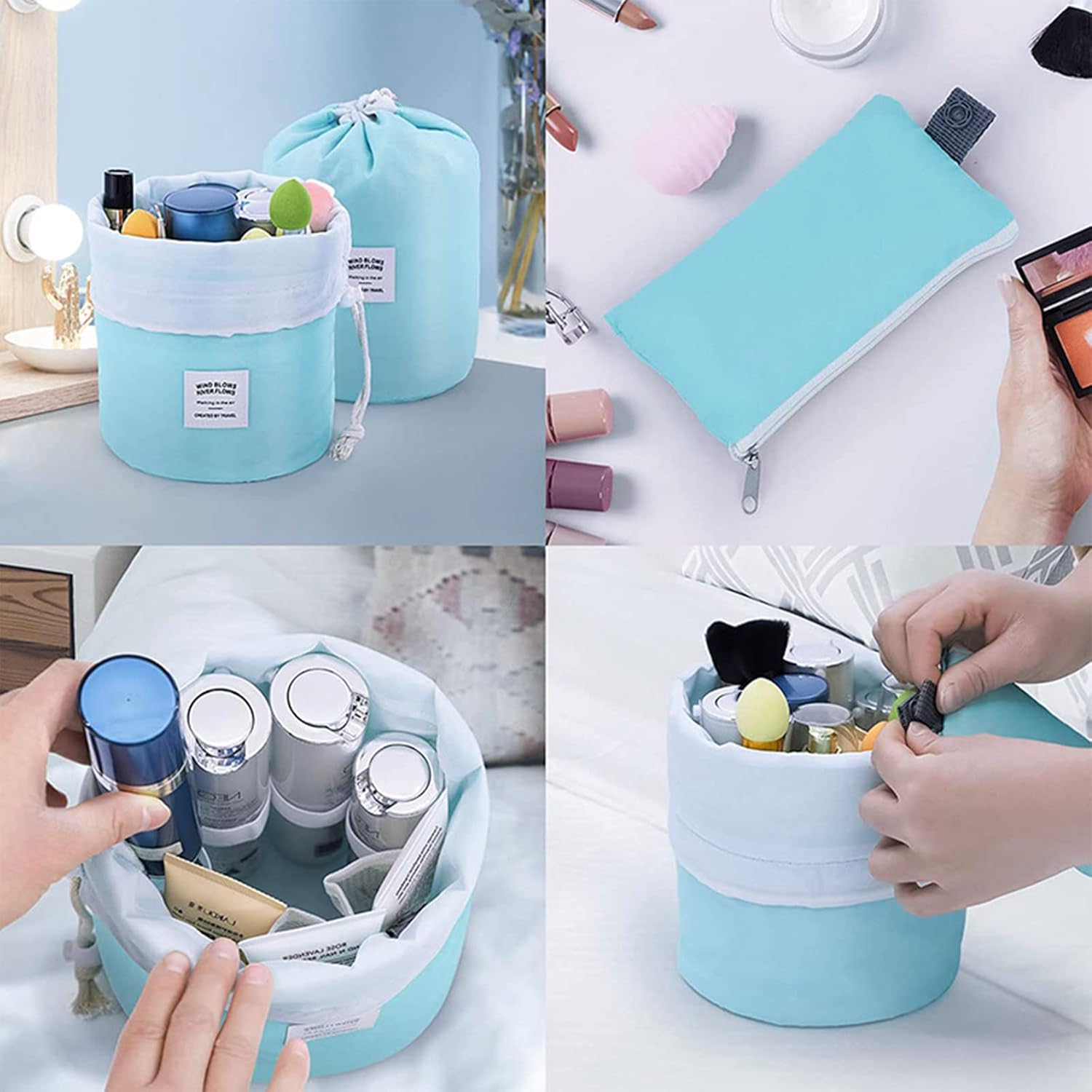 INVODA 2PCS Cosmetic Bag 2 Pieces Barrel Shaped Travel Makeup Bags Large Capacity Soft Waterproof Portable Drawstring Cosmetic Bag Multifunctional Bucket Toiletry Bag (Pink+Green)