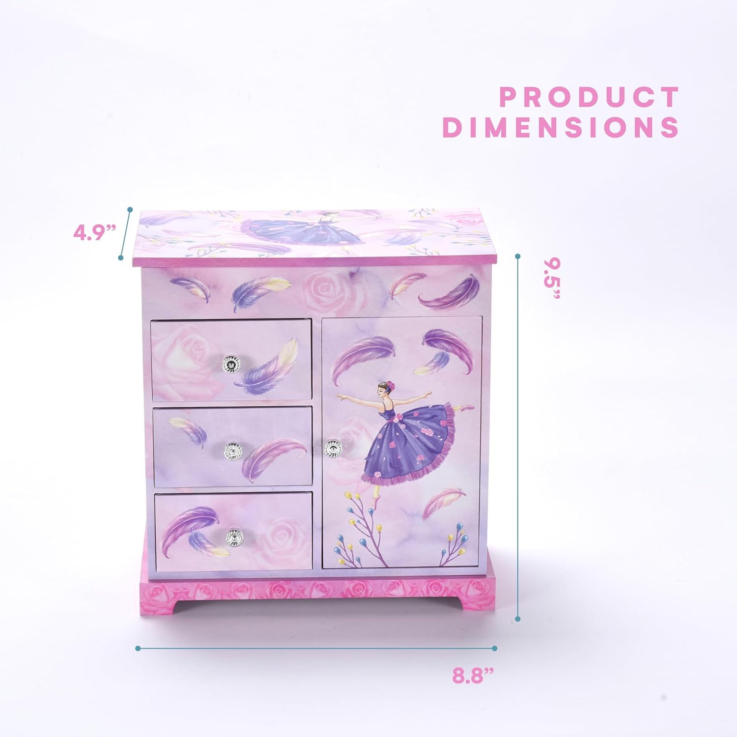 Enchanting Ballerina Magic: Our pink and purple ballerina jewelry box, crafted from sturdy wood, combines functionality, beauty, and a touch of magic. Surprise and delight the young jewelry enthusiast in your life.
