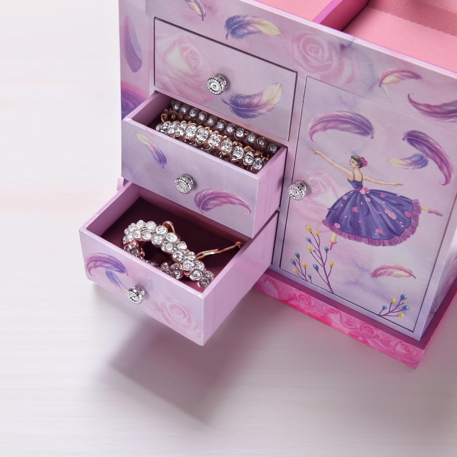 Effortless Jewelry Organization: Neatly organize jewelry with our pink and purple ballerina 4 drawer jewelry box. It features a built-in necklace carousel for rings, earrings, and bracelets, keeping everything in one place.