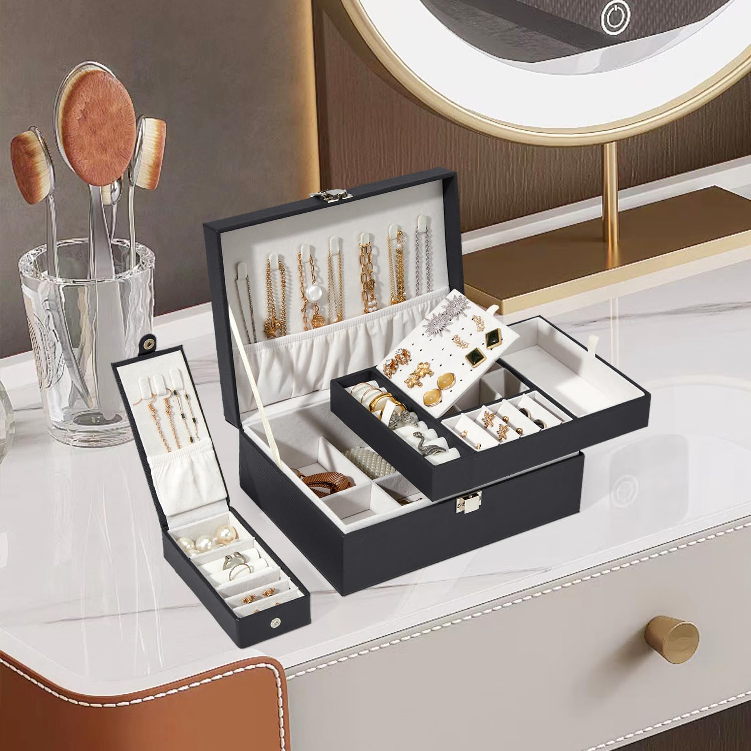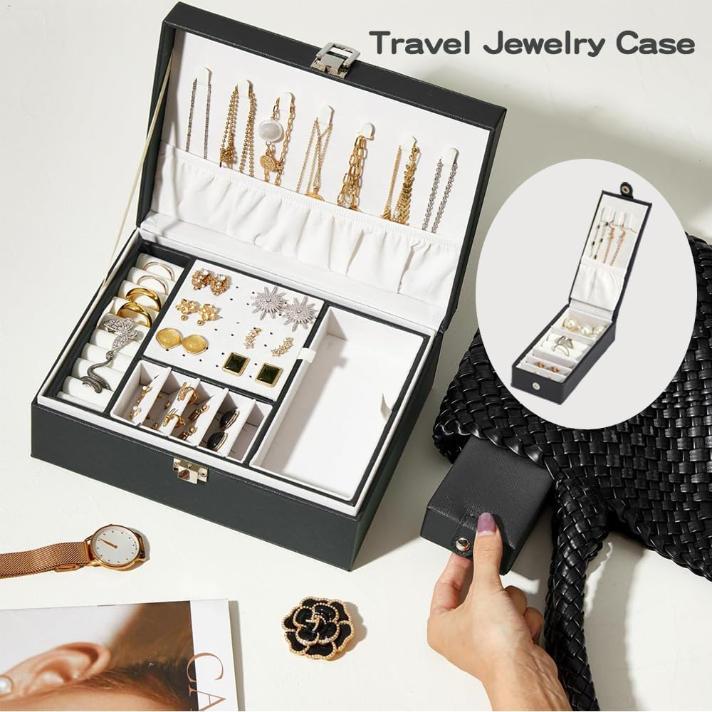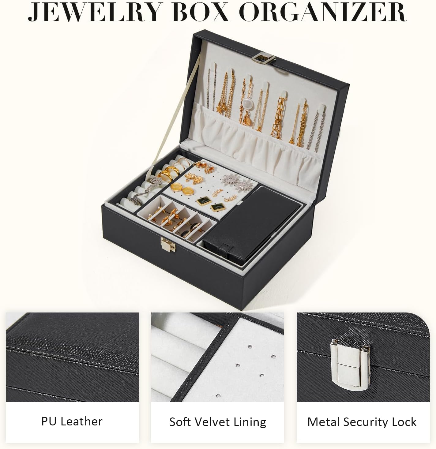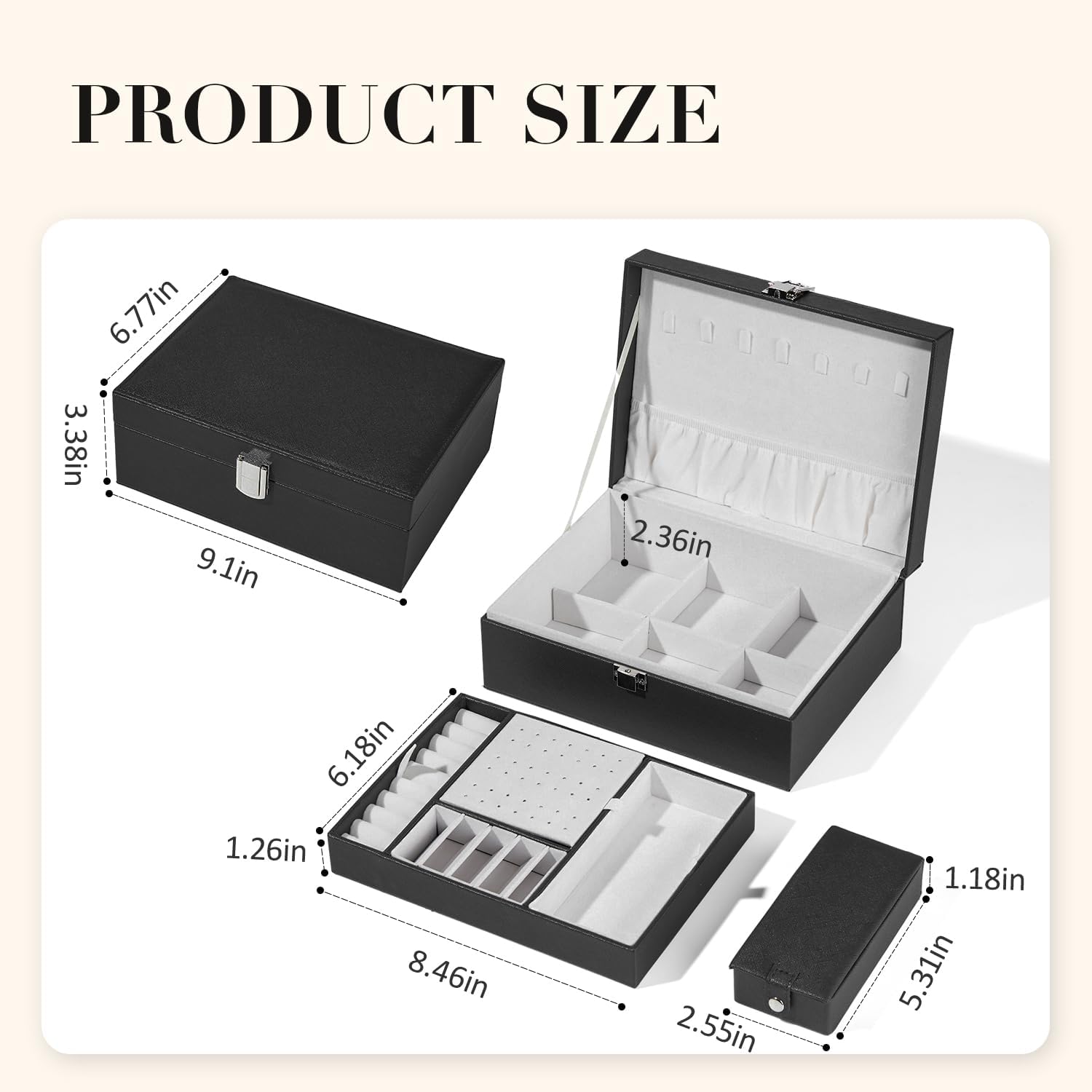 Jewelry Box, 2 Layers PU Leather Organizer with Small Travel Case, Jewelry Organizers and Storage Makeup Organizer for Earrings, Rings, Necklaces, Bracelets – Black
