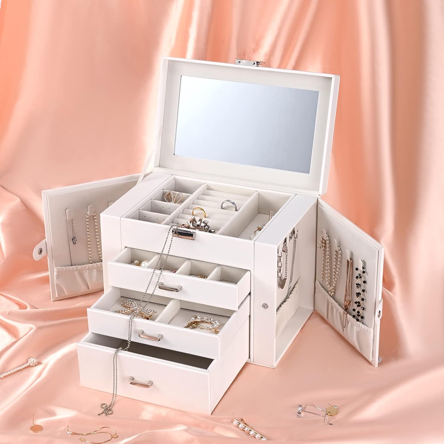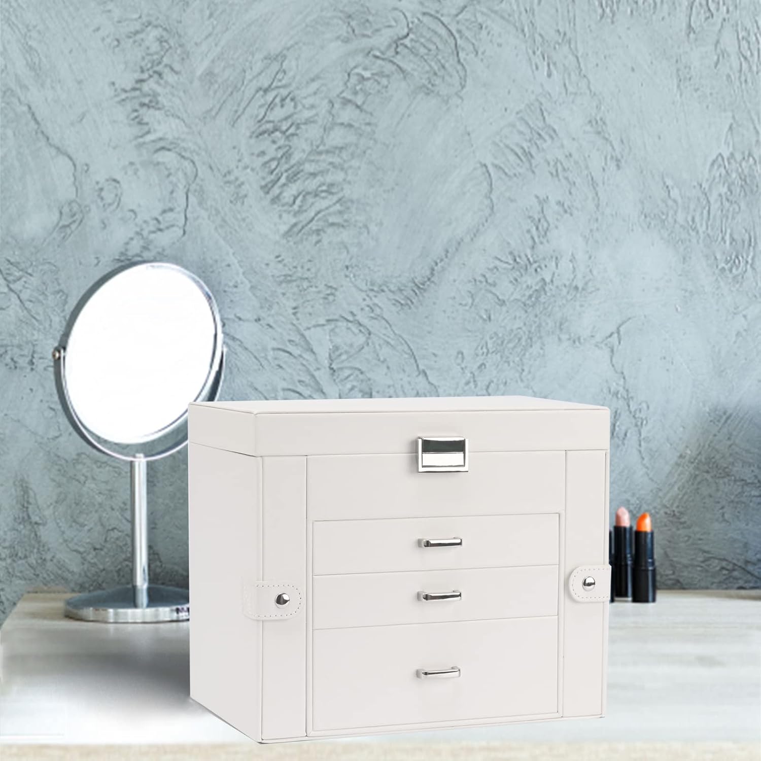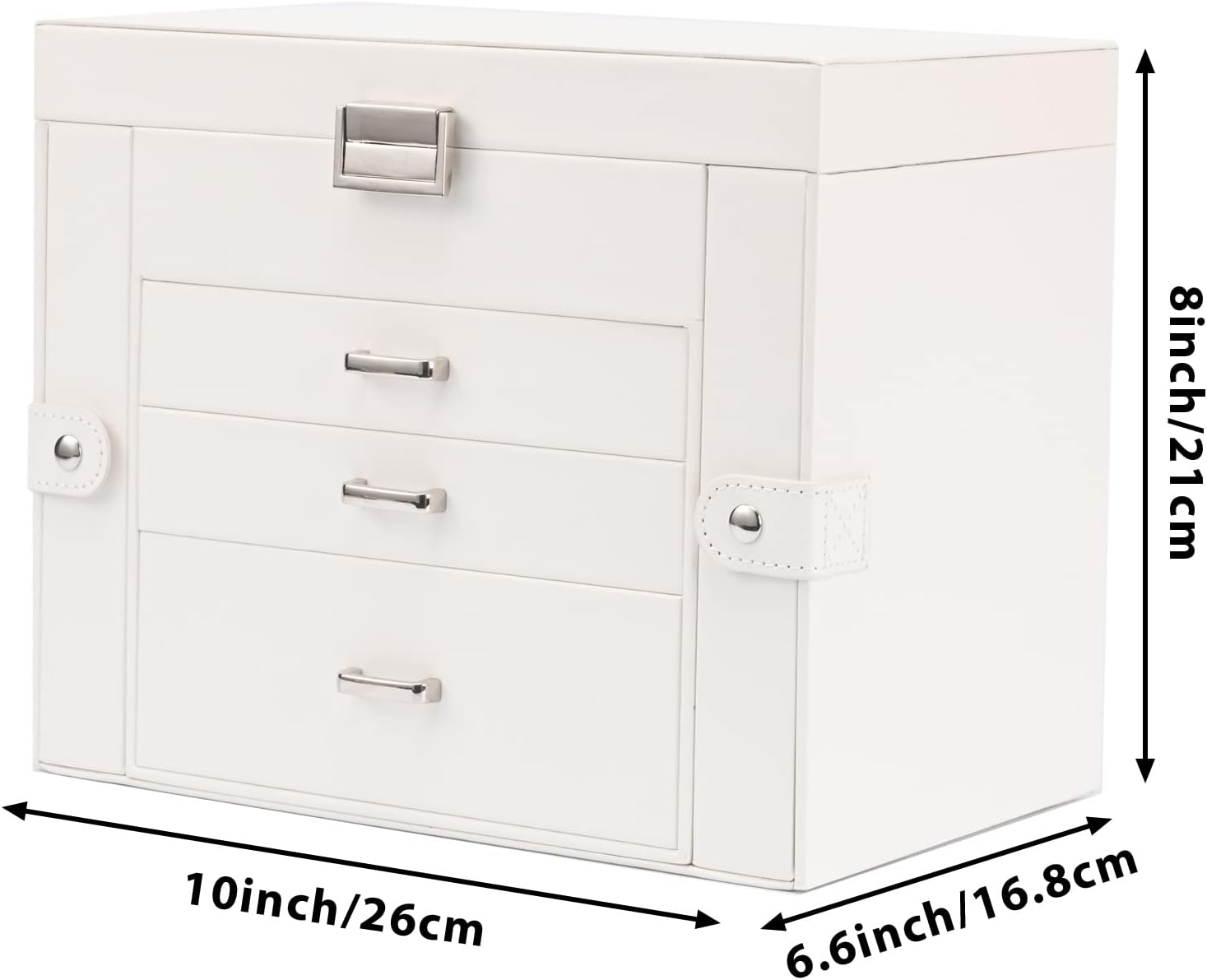 Jewelry Box for Women 4-layer Leather Large Jewelry Organizer Box with Drawers&Mirror for Necklace/Ring/Earring/Watch Storage (White)