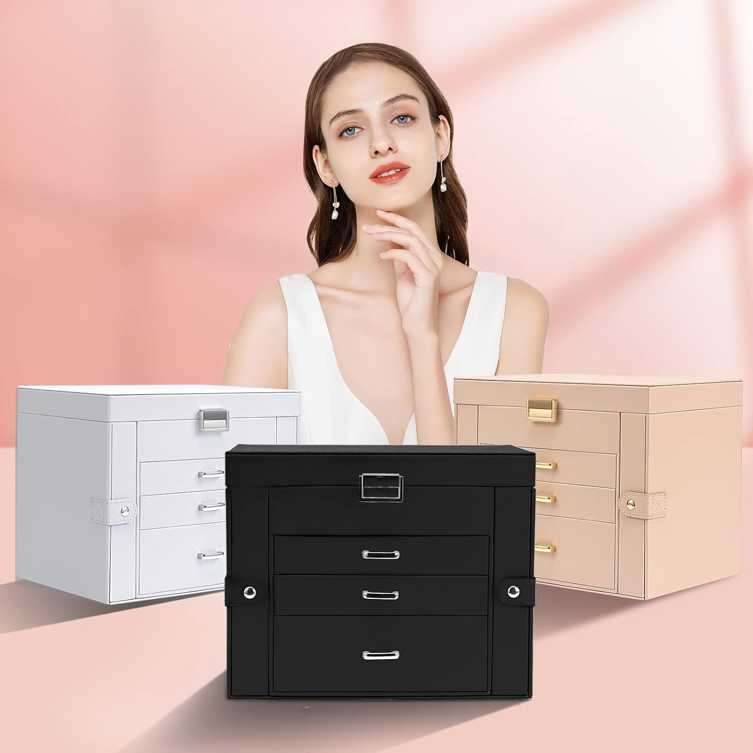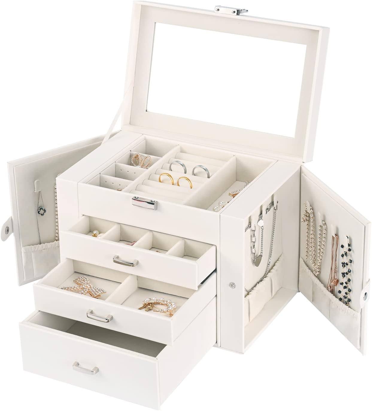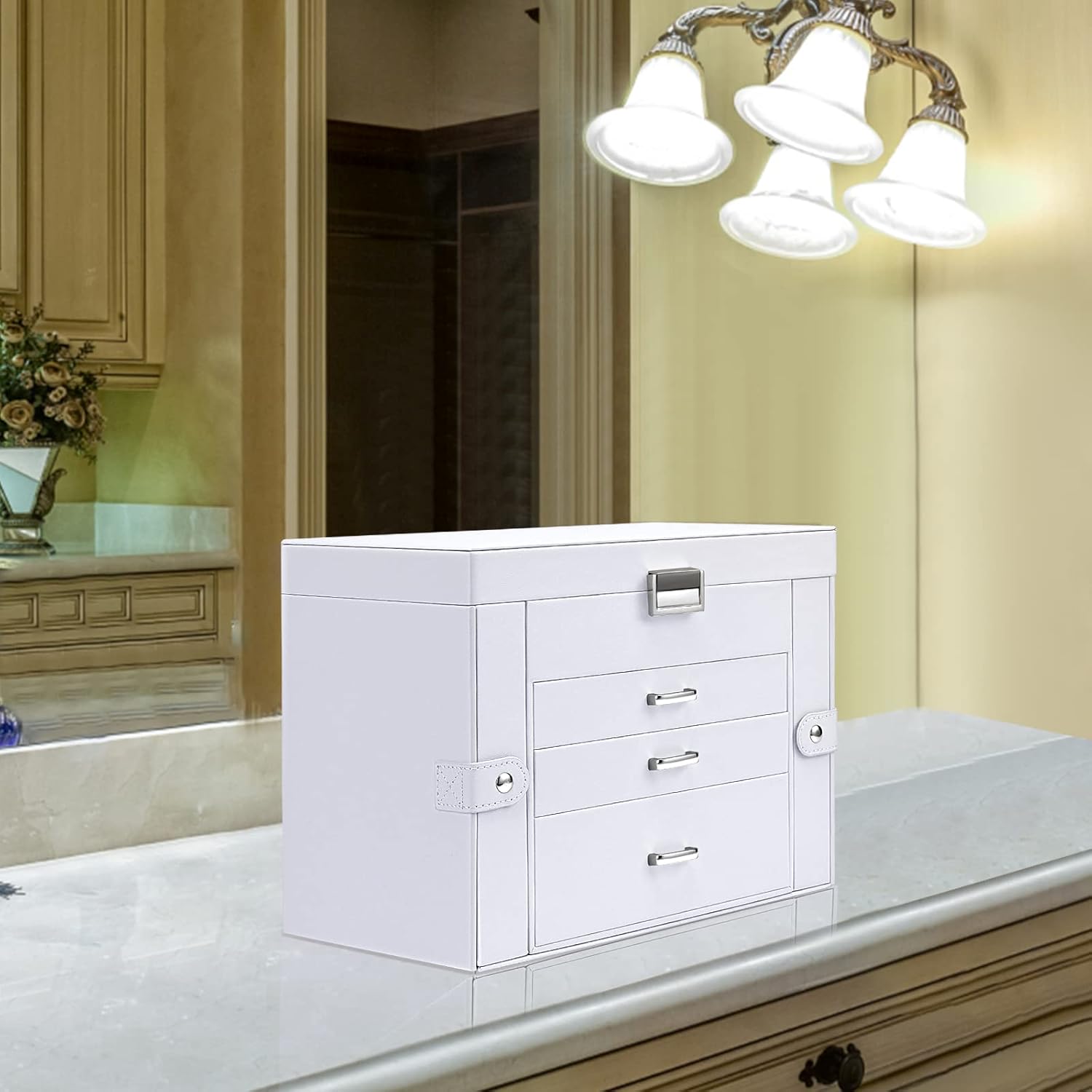Jewelry Box for Women 4-layer Leather Large Jewelry Organizer Box with Drawers&Mirror for Necklace/Ring/Earring/Watch Storage (White)