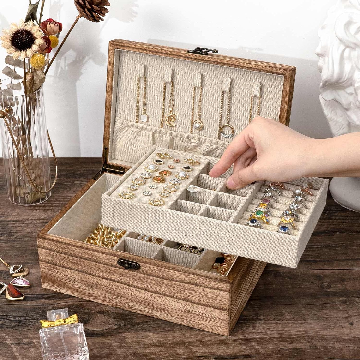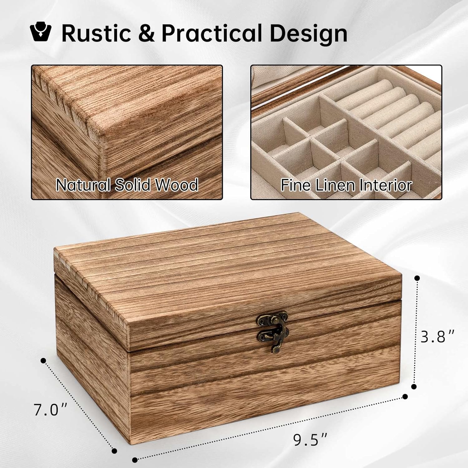 Jewelry Box Organizer, Solid Wood Jewelry Boxes for Women, Double Layer Jewelry Organizer Box Display Earring Necklace Bracelet Ring, Rustic Style Small Jewelry Box for Girls