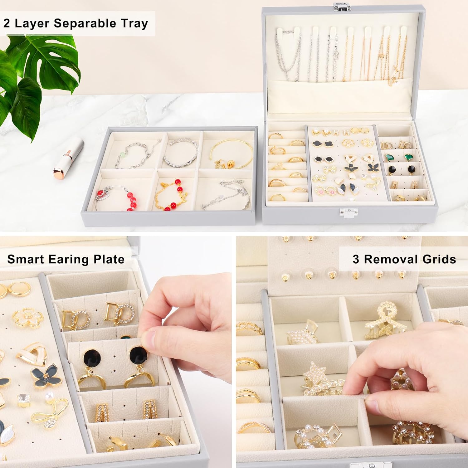 Jewelry Box with Removable Tray, PU Leather Jewelry Organizer Box for Necklace, Earring, Ring, Silver Gray Travel Jewelry Case for Christmas Birthday Gift