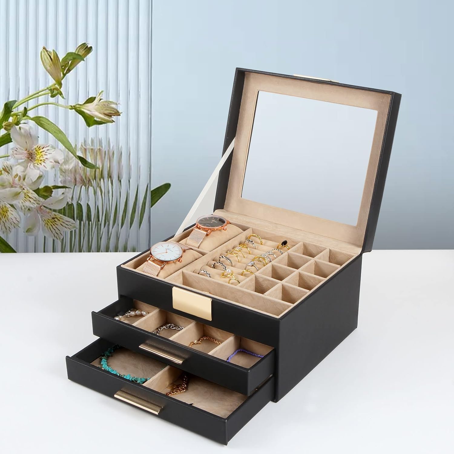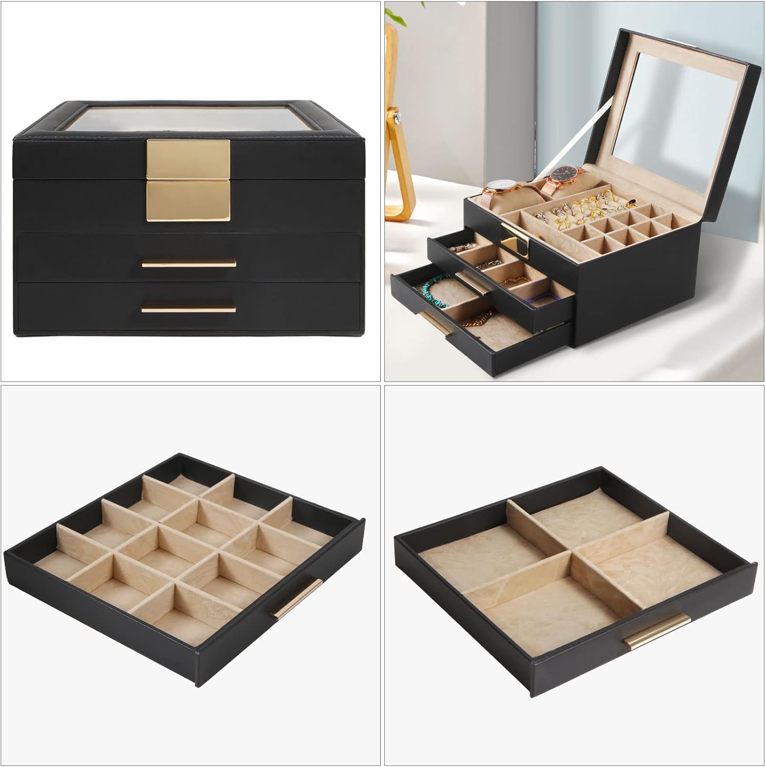 4 layers of storage, more storage space: neat rows for rings, 15 separate compartments, large tray for necklaces, watch pillow and glasses compartments, 4 layers of storage space with neat layout, every type of your jewelry can find its place here.