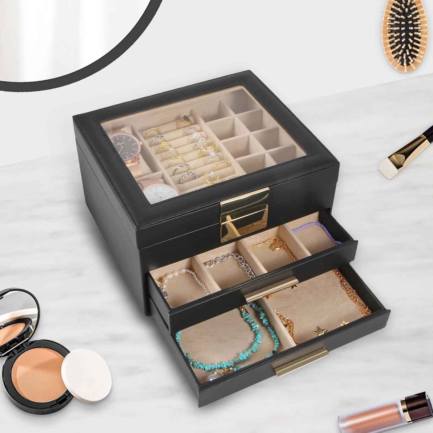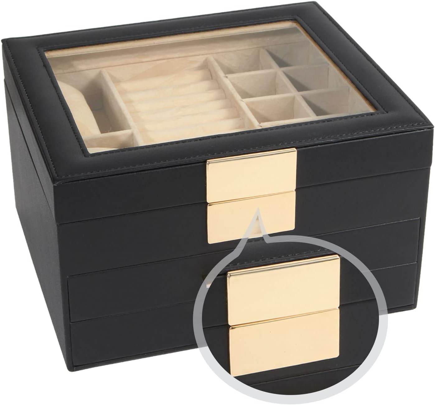 Transparent top cover at a glance: The transparent top cover of this jewelry box allows you to easily find the jewelry you need to wear today. At the same time, it can prevent dust and keep your jewelry shining forever. If you have friends visiting, you can easily show them your jewelry
