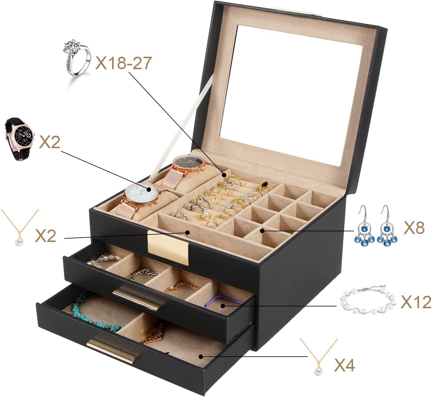Watch storage, unique design: more than 40 rings, 15+ earrings, necklaces and even watches and glasses can be stored. On the last floor of the jewelry box, there are glasses compartments and 4 watch pillows. your watches and glasses can finally fit in the jewelry box as well, providing more possibilities for your jewelry storage.