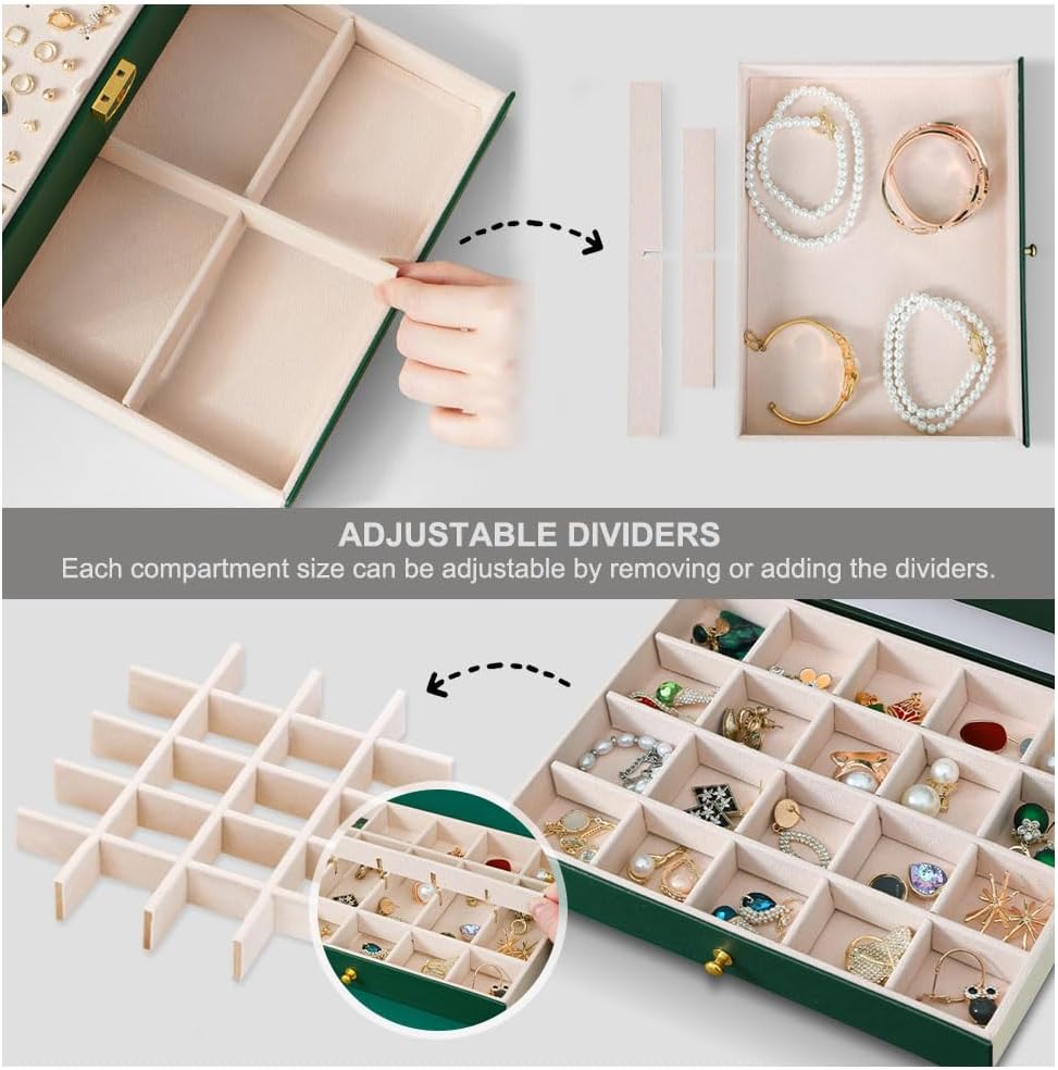 【Multi-functional Jewelry Box】3 layer jewelry holder organizer with removable inner dividers,You can adjust the size and number of compartments by removing or adding the dividers allowing you to customize it to perfectly match your unique preferences. effortlessly adapt the box to accommodate various jewelry sizes and styles.