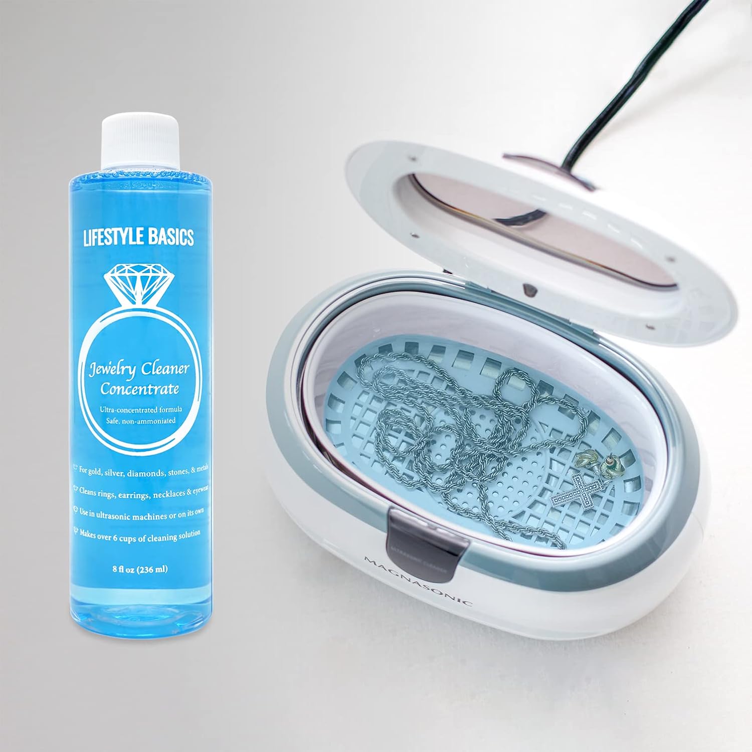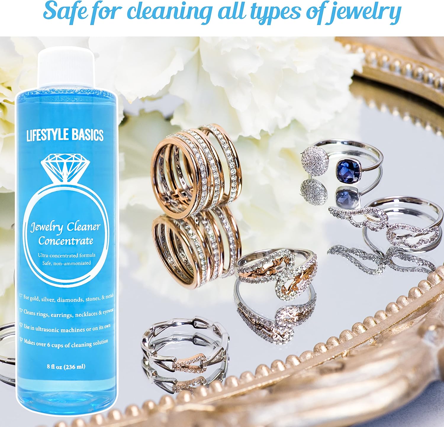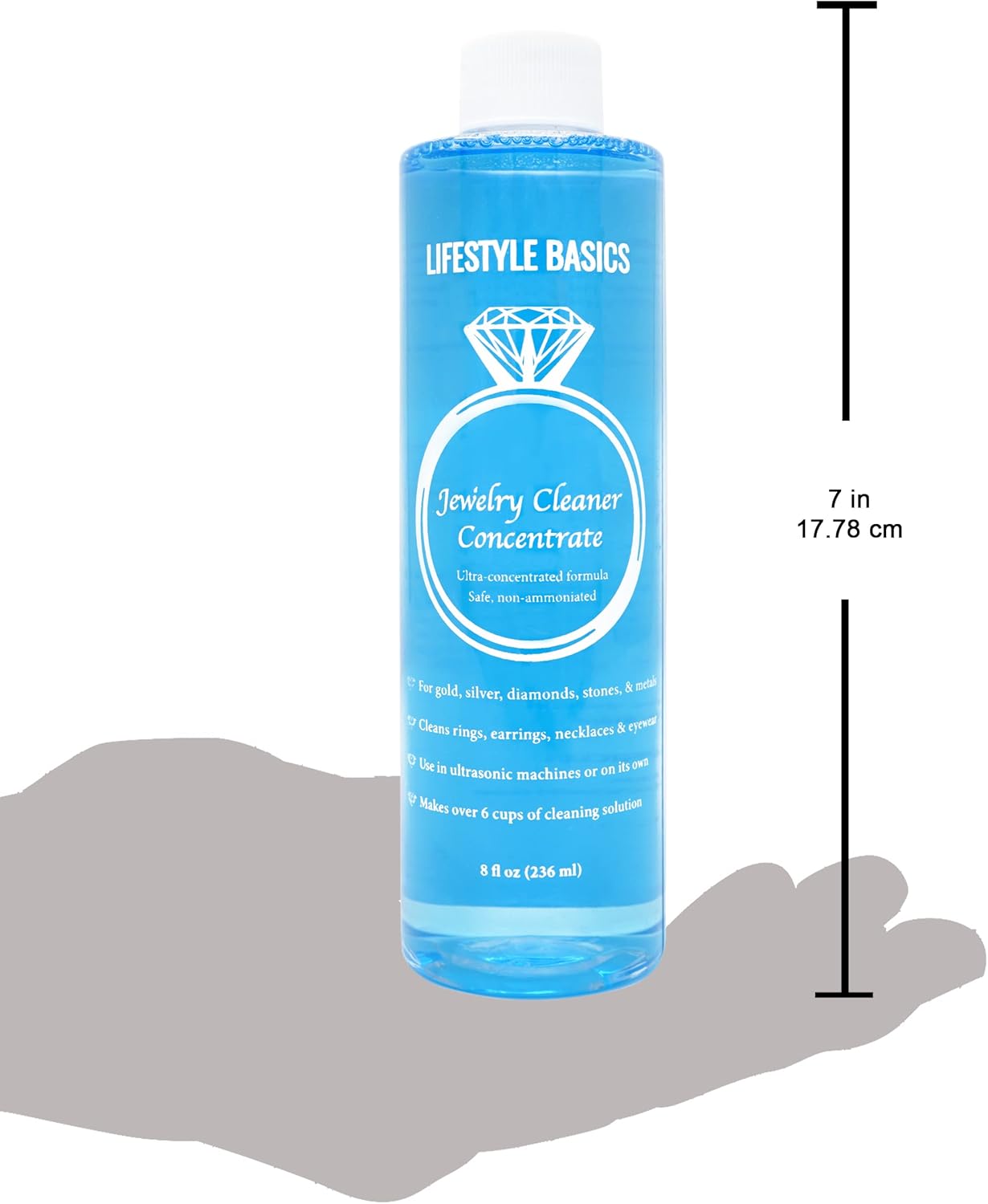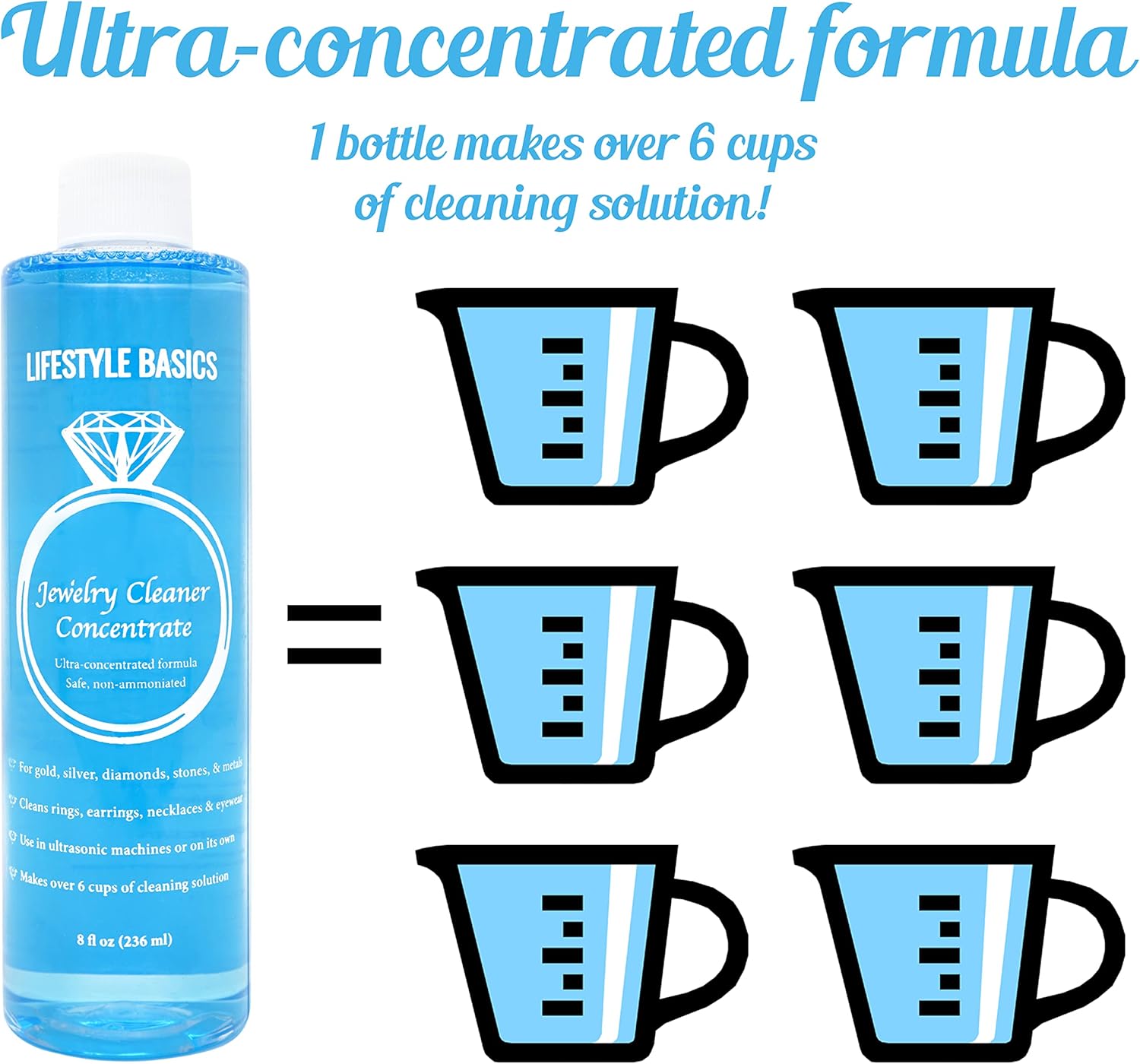 Jewelry Cleaner Solution Liquid Concentrate 8 oz | Cleans Rings, Earrings, Necklaces, Eyewear | Safe for Diamonds, Gold, Silver, Gemstones, and Metals | 1 Bottle Makes 8 Cups