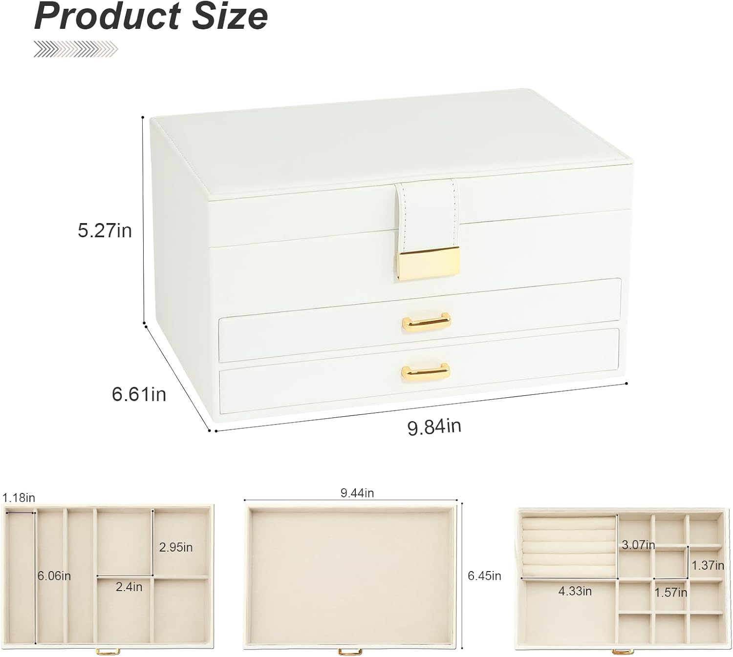 Jewelry box is made of premium engineered wood and is not easy to deform. With durable PU leather and soft imitation fur lining. Perfect for protecting your beloved jewelry from scratches and damage. Large-capacity size (L x W x H): 9.84″ x 6.61 “x 5.27”.
