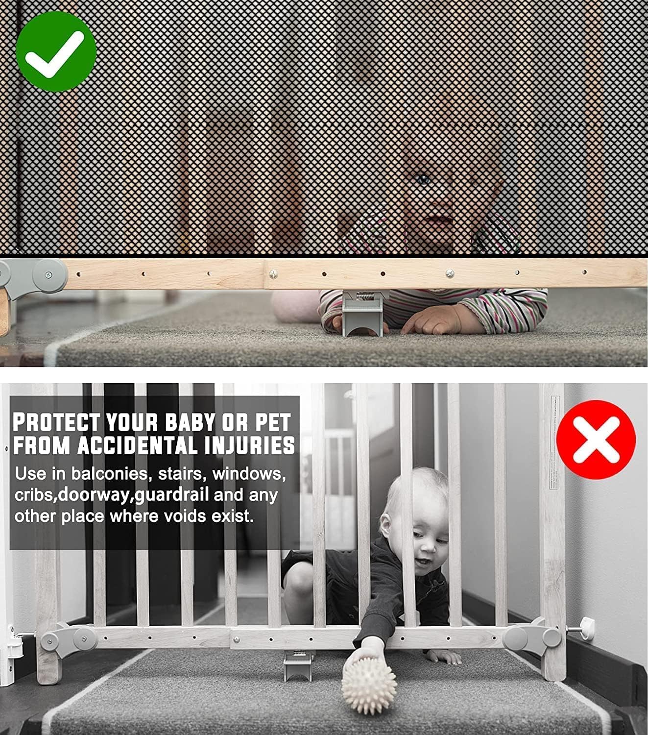 【Widely Used】Perfect stairway net for indoor and outdoor use. You can use the net for kids’ crib, corridor, décor, balcony, etc. to keep kid safety, toy safety, and pet safety.
