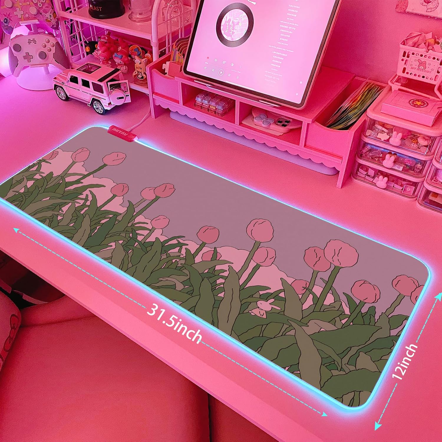 JMIYAV Pink RGB Gaming Mouse Pad 31.5×12 Inch PC XL Large Extended Glowing Led Light Up Desk Pad Non-Slip Rubber Jmiyav Base Computer Mouse Pad Cute Mousepad Mat 31.5×12 Inch Tulip
