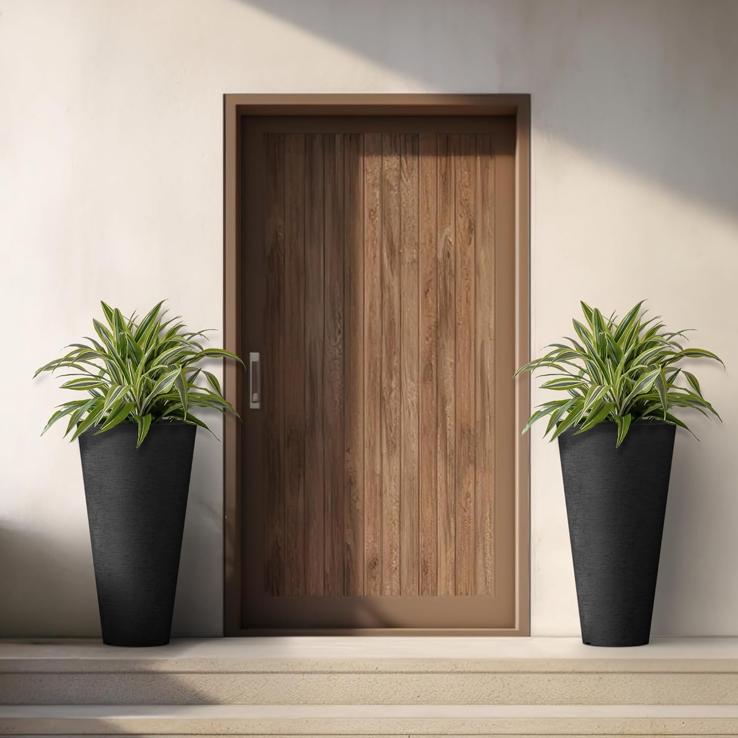 Kante Tall Round Planter Set of 2, 18″ H Large Decorative Planter Pots for Outdoor Indoor Garden Patio Front Porch (Black)Premium Tall Planters – Meticulously crafted with durable construction and superior workmanship, our planters are made from high-quality plastic, ensuring longevity, weather-resistance, and color retention. Whether utilized indoors or outdoors, these tall round planters are suitable for all seasons.Spacious & Versatile – Our planter boasts ample capacity, fostering optimal plant growth and development. Whether planting directly inside the planter or using potted plants, its generous space accommodates both. Moreover, the integrated handle facilitates effortless removal of the inner planter, ensuring convenient plant maintenance.Minimalist Chic – Elevate your space with these tall and wide planters, embodying sleek lines and a contemporary black finish—a defining trend in modern landscape design. The textured surface introduces an artistic touch to your garden, patio, office, living room, or front door area.Built-In Drainage System – The inner pot of our planter incorporates 48 drainage holes, facilitating the efficient removal of excess water. This design enables proper moisture absorption from a water tank into the substrate, ensuring optimal soil moisture and oxygen levels. This fosters the healthy growth of plants and trees.Guaranteed Satisfaction – Our dedication to exceptional customer service ensures that if you’re dissatisfied, we’ll promptly provide a full refund or a replacement product, ensuring your complete satisfaction.