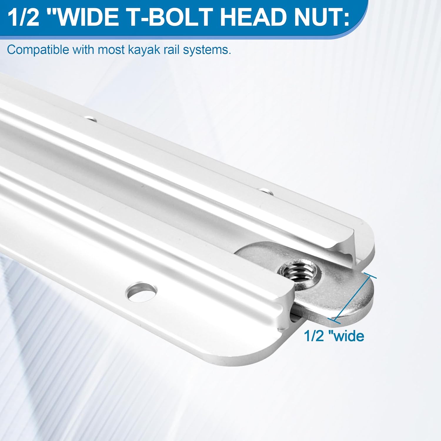 𝟏/𝟐 “𝐖𝐢𝐝𝐞 𝐓-𝐛𝐨𝐥𝐭 𝐇𝐞𝐚𝐝: Kayak track nut adopt 1/2” wide T-bolt head nut, which can be compatible with Scotty Fishing Products, RAM Mounts and YakGear’s YakAttack MightyMount, GearTrac and most other kayak rail systems. Please make sure track nut matches your kayak hardware before purchasing.