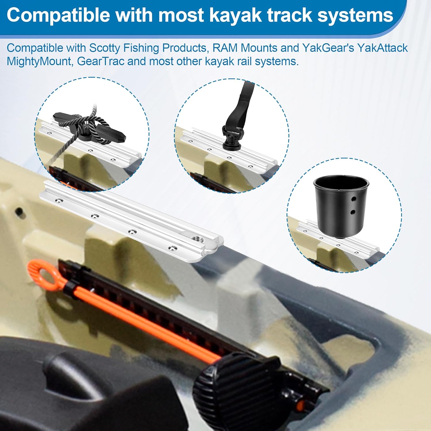 𝟏/𝟐 “𝐖𝐢𝐝𝐞 𝐓-𝐛𝐨𝐥𝐭 𝐇𝐞𝐚𝐝: Kayak track nut adopt 1/2” wide T-bolt head nut, which can be compatible with Scotty Fishing Products, RAM Mounts and YakGear’s YakAttack MightyMount, GearTrac and most other kayak rail systems. Please make sure track nut matches your kayak hardware before purchasing.