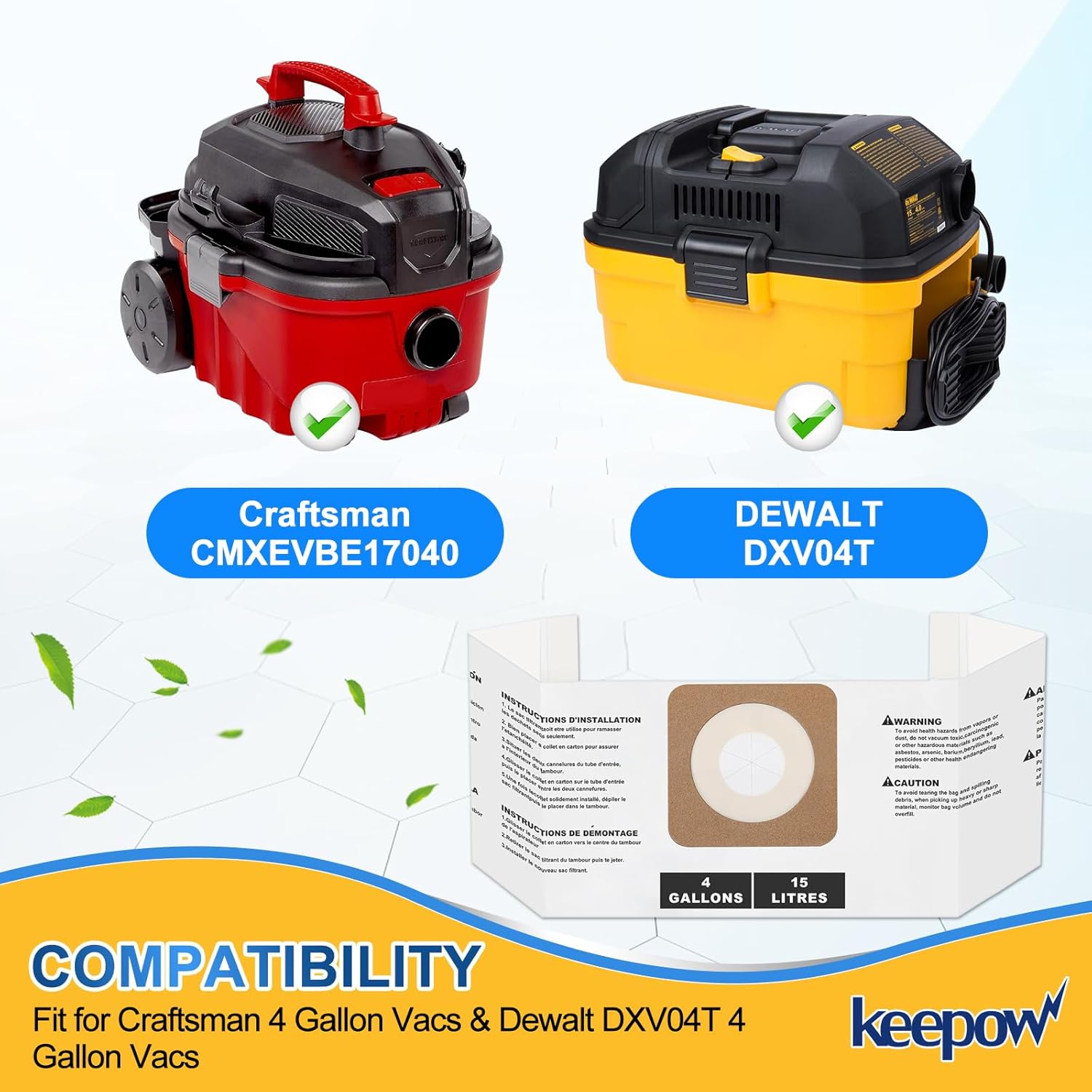 KEEPOW Shop Vac Bags Compatible with Craftsman 4 Gallon Wet/Dry Vacuum & for Dewalt DXV04T 4 Gallon Vac, shop vac accessories, Replacement Part# CMXZVBE43270 43270 (8 Pack)