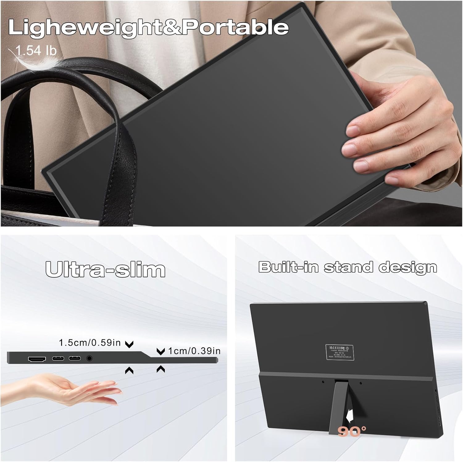 Ultra-portable monitor: The travel monitor is definitely the ideal companion for your business trips and home office, with an ultra-lightweight of 1.54 pounds and an ultra-slim design of 0.39 inches, it can be easily tucked into your handbag and carried around, and can be connected with just a Type C cable to enhance your productivity anytime and anywhere!