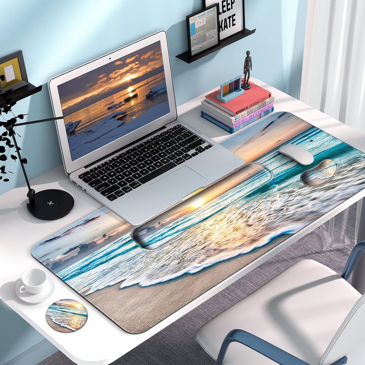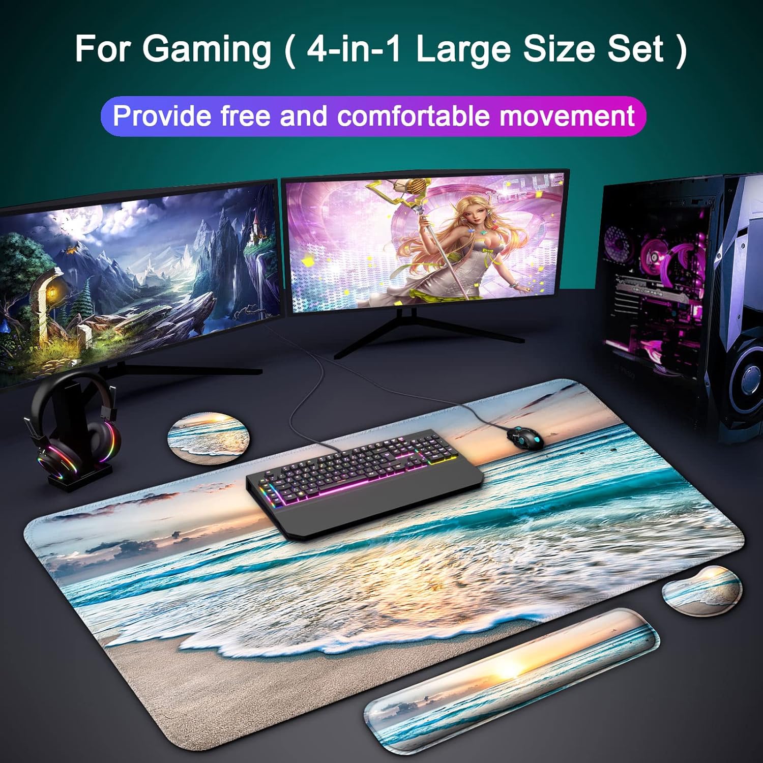 Keyboard Wrist Rest + Mouse Pad with Wrist Support + Desk Mat + Coaster 4 in 1 Set, XXL Large Gaming Mousepad Cute Ergonomic Mouse Pads for Desk Computer Laptop Office Decor-Beach