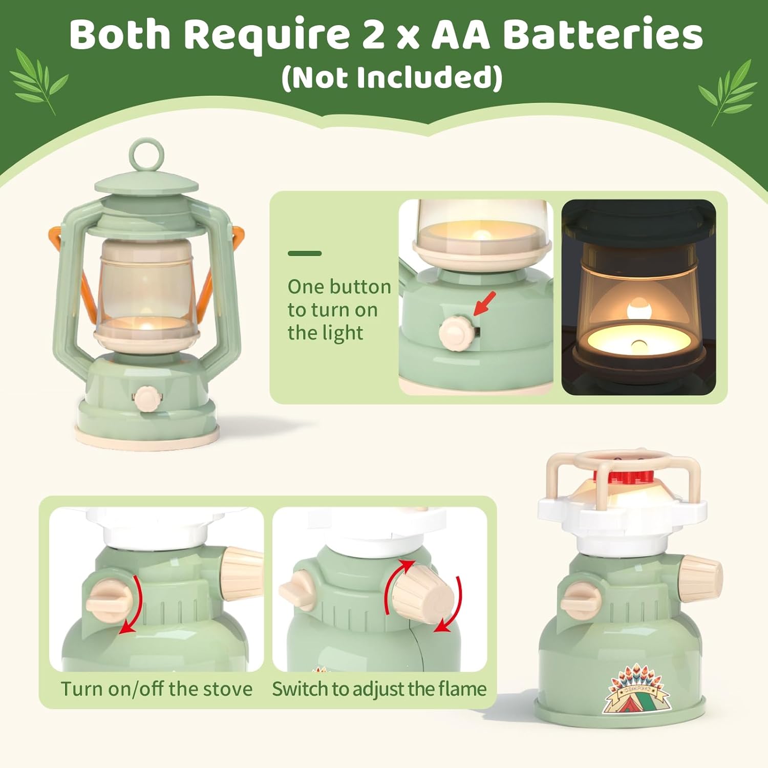 🍽️Simulate Real Camping Activities: Children can light oil lamps and read and play in the camping tent. Cook with a pretend gas stove and food toys. The stove will glow with a red flame. Both the oil lamp and stove require 2 AA batteries (not included). Use binoculars and compass to explore things. Whether winter or summer, indoor or outdoor, little boys and girls can experience a fun and realistic camping trip.