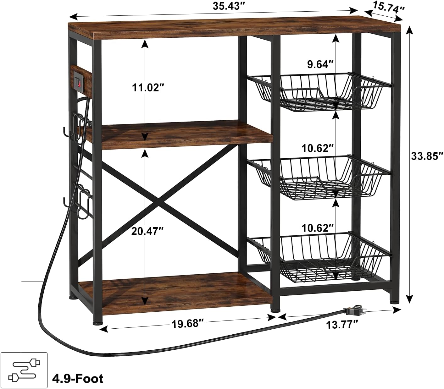 Kitchen Island, Baker’s Rack with Power Outlet, Microwave Stand, Coffee Bar with 3 Removable Wire Baskets, Kitchen Storage Rack with 6 S-Hooks for Spices, Pots and Pans – Rustic Brown
