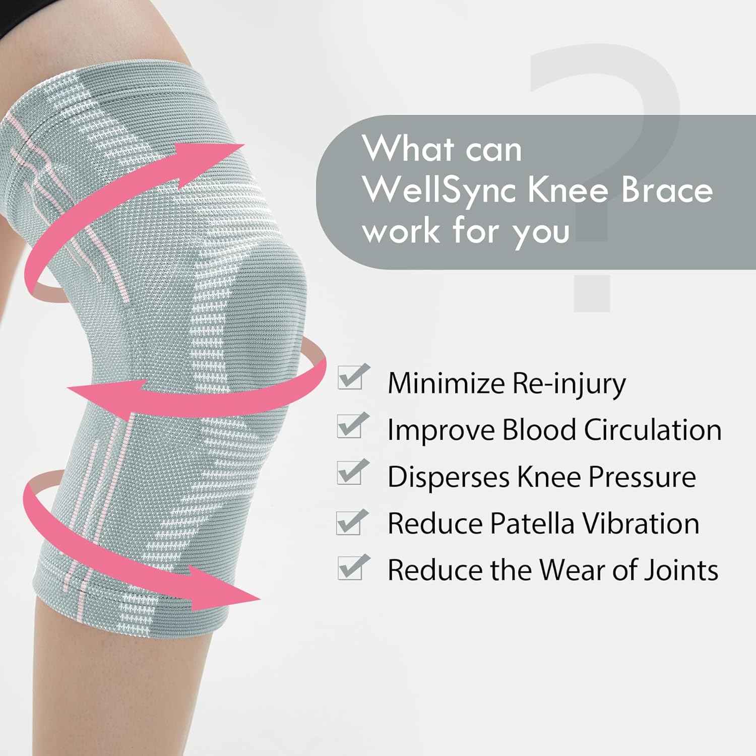 Professional Knee Brace, Medical Grade Pain Relief and Injuries Recovery.WellSync knee sleeve with patella gel pad & Double-sided spring stabilizers effectively prevent potential sports injuries, best choice for sports protection and pain relief.The knee brace is made of high-elastic fabric to compress and wrap the knee joints; offers optimal compression to boost blood circulation for better recovery.Unique 3D knitting technology to ensure the knee brace is breathable and sweat-absorbing.Helping ease painful knees caused by a meniscus tear, arthritis, ACL, PCL, MCL, sports injury recovery, and knee surgery; Stabilizing the knee joints to provide outstanding sports prevention and protection like weightlifting, volleyball, football, walking, tennis, jog and basketball