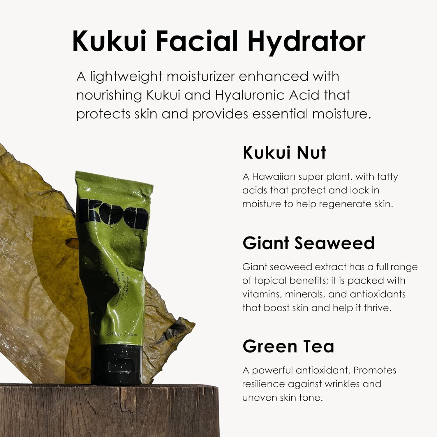 KEY INGREDIENTS FROM HAWAII. Our Kukui Nut Facial Hydrator is formulated with traditional ingredients, born in Hawaii, and made for all. In this product you’ll benefit from nourishing elements such as Kukui Nut, Giant Seaweed, and Green Tea.