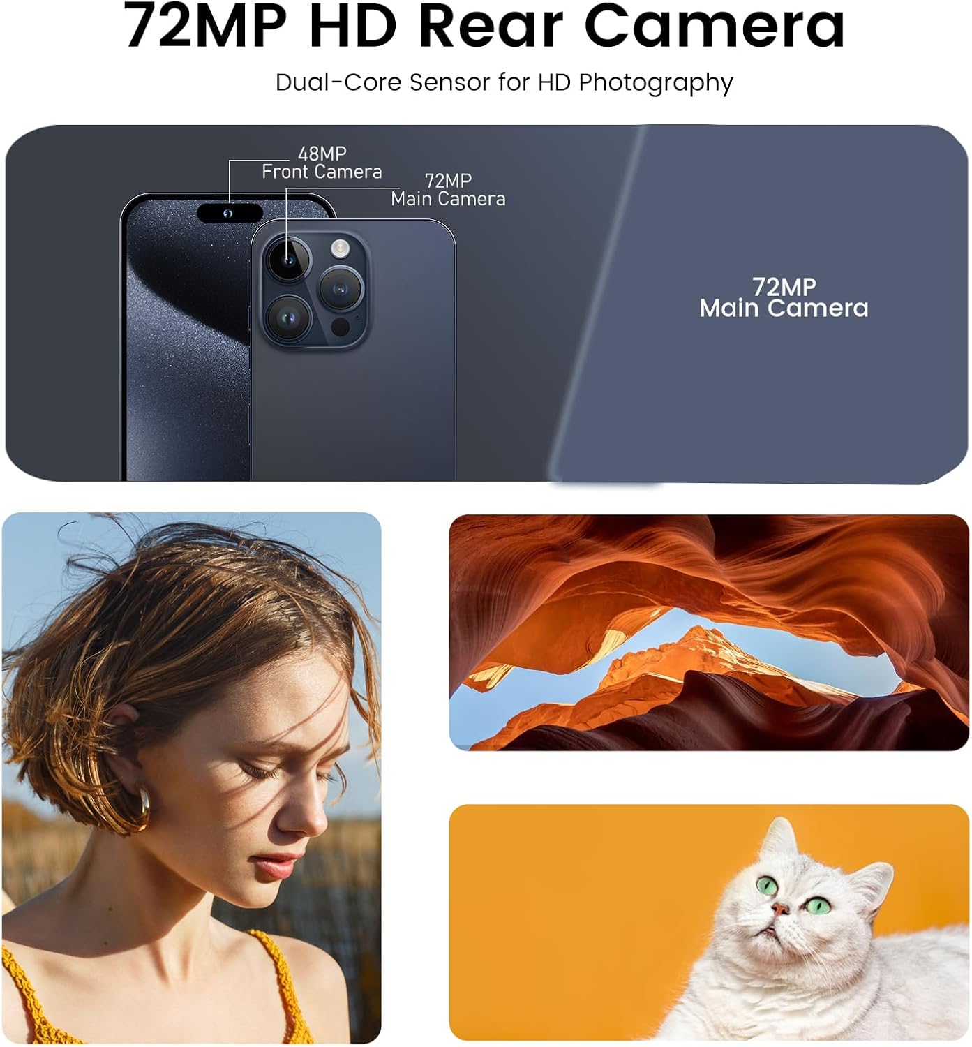 📸【EXCELLENT CAMERA FEATURES】 Unleash your photographic potential with our smartphone’s powerful 72MP + 48MP dual camera setup. Every shot is an opportunity to capture stunning details and vivid images. Record life’s precious moments with exceptional clarity. Say goodbye to blurry, low-quality photos – With this smartphone, you can capture and share truly compelling, high-resolution images.