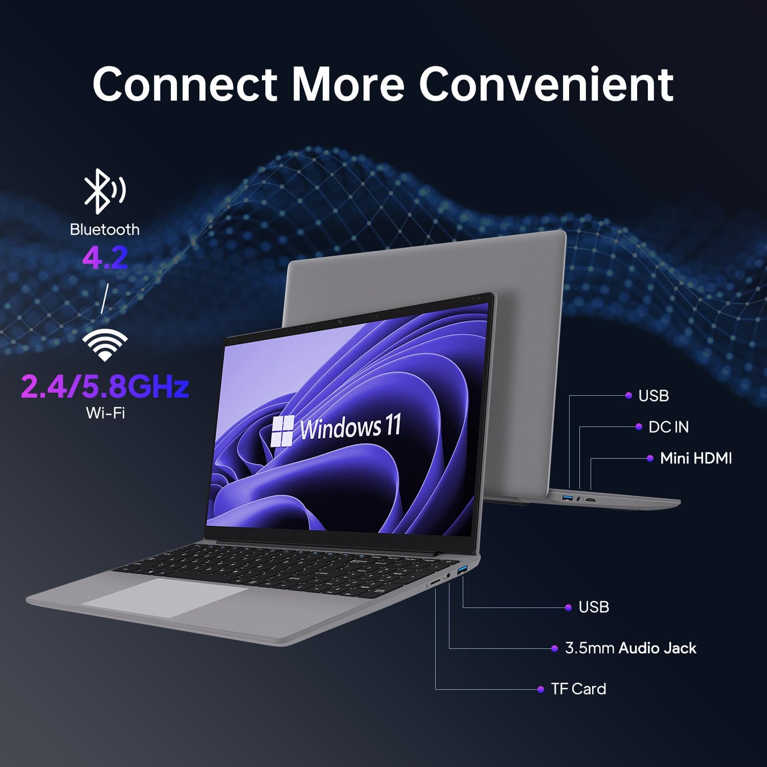 [Full Functional]This traditional laptop computer has a fully functional type c for charging or data transfer and a normal HD port for external screen or projection, moreover, there is a 2xUSB3.2, 1×3.5mm Headphone Jack, and 1xTF Card slot. Supports 2.4G/5.8GHz WIFI, always online. A full-size Ergonomic standard keyboard design, Allows you to enjoy comfortable and accurate typing. and big trackpads make you work efficiently.