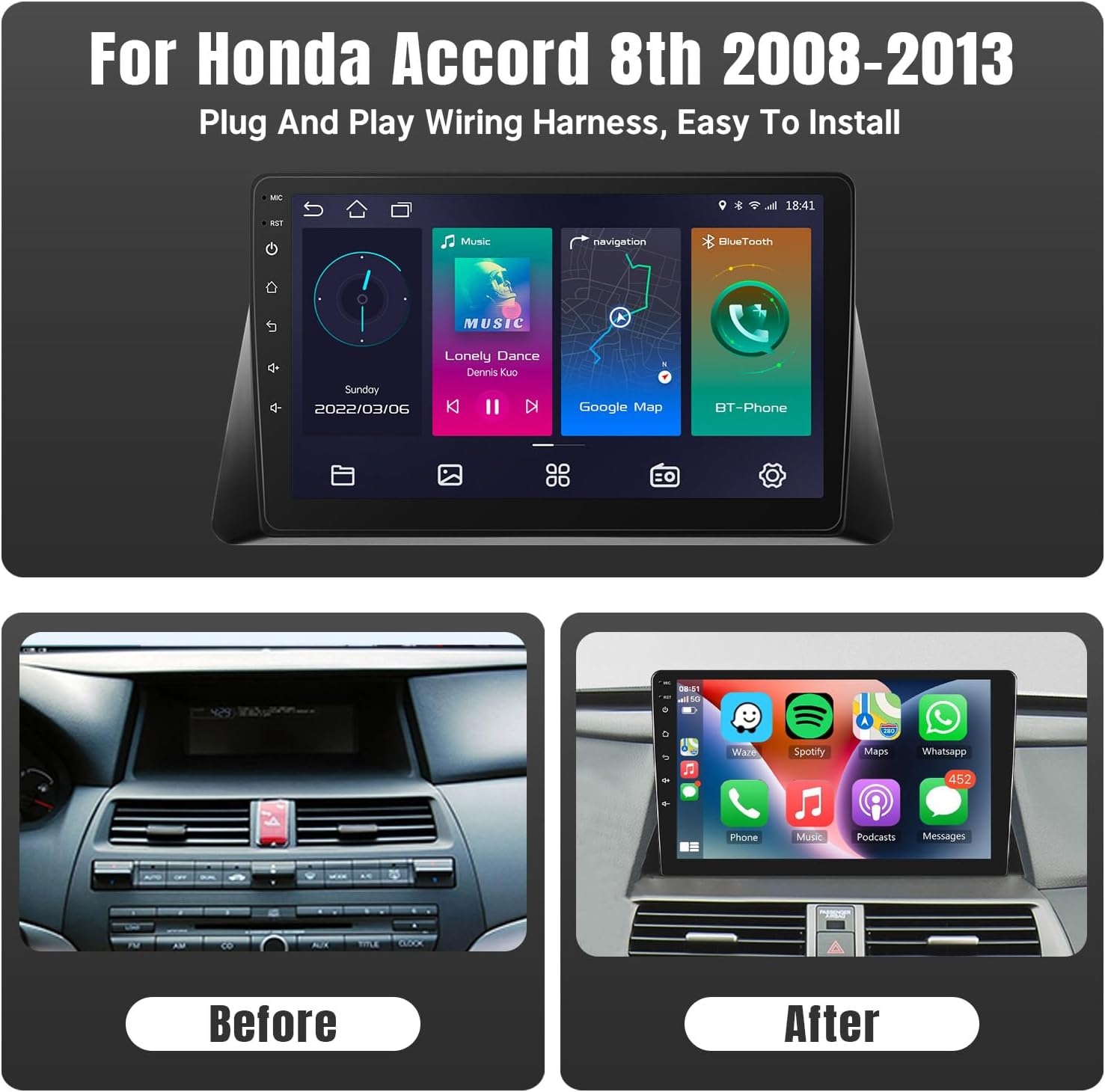 🚘 Built-in Wireless CarPlay & Android Auto – Honda Accord 8th radio with wireless Apple CarPlay/Android Auto voice control function for Accord 8th Multimedia Display (2008-2013) . Users can realize Apple CarPlay voice control to access car system making phone call, GPS navigation, playing video and music, sending and receiving messages, etc.