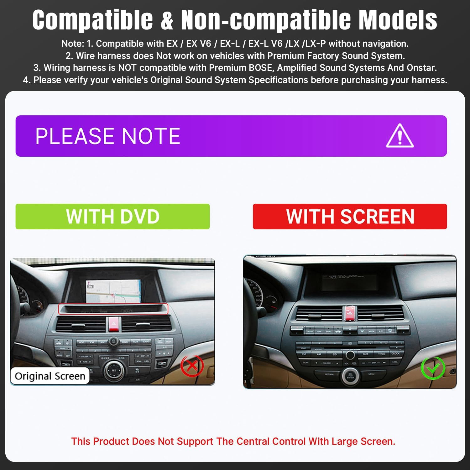 👁️🗨️ Note: 1. Compatible with EX / EX V6 / EX-L / EX-L V6 / LX / LX-P without navigation. 2. Wire Harness Does Not Work On Vehicles With Premium Factory Sound System. 3. Wiring Harness Is NOT Compatible With Premium BOSE, Amplified Sound Systems And Onstar. 4. Please Verify Your Vehicle’s Original Sound System Specifications Before Purchasing Your Harness.