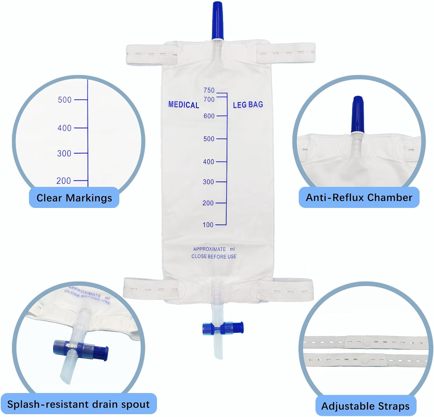 【Leg Bag Urinary Drainage Bag】750 ml Leg Bag Urinary Drainage Bag, Anti-Reflux Chamber. Made of medical-grade material, durable construction for odor containment and leak resistance.