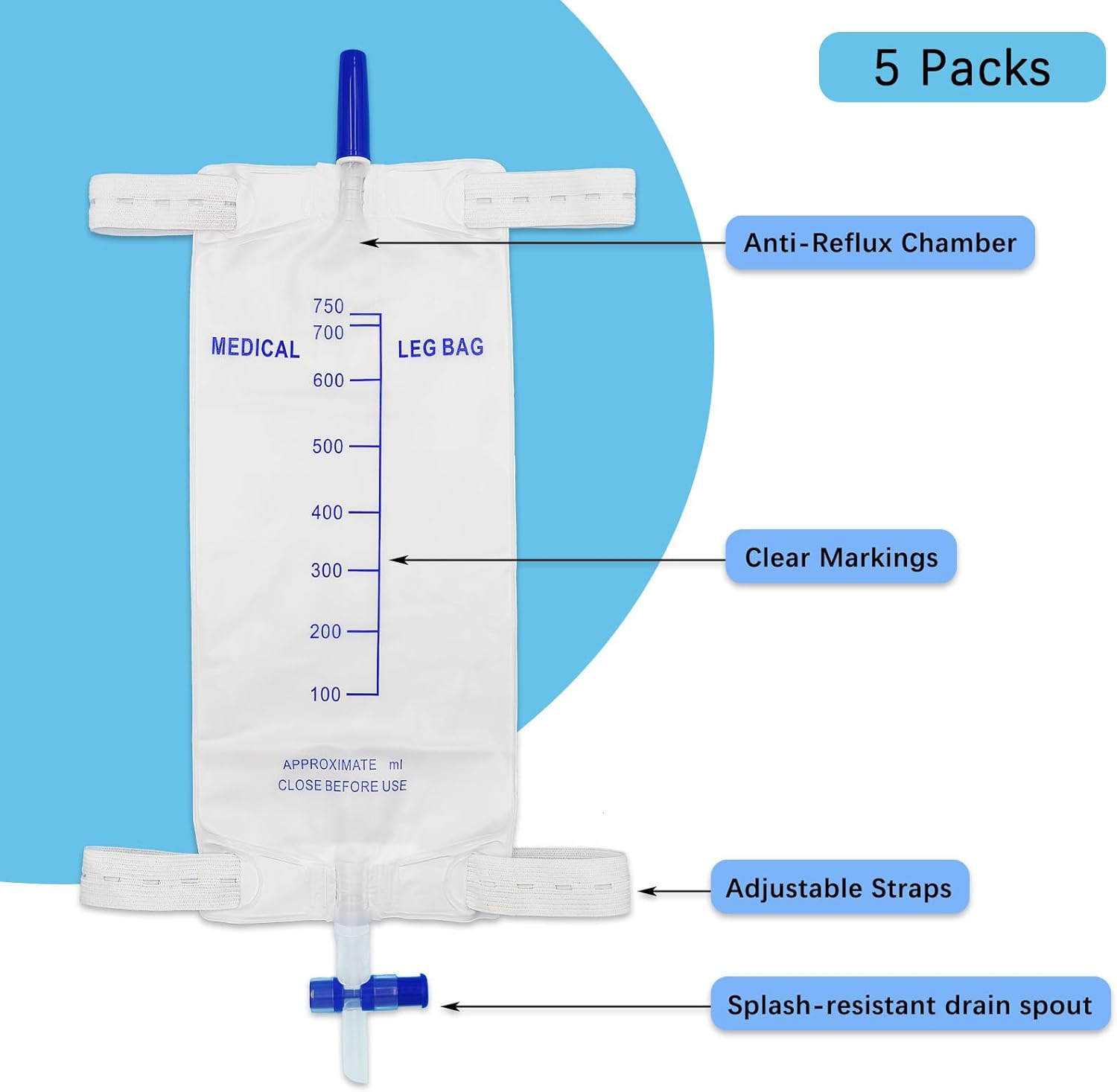 Leg Bag Urinary Drainage Bag, 750ml-1000ml, Urine Collection Bag with Anti-Reflux Valve, Adjustable Cloth Straps (750ml-5 Packs)