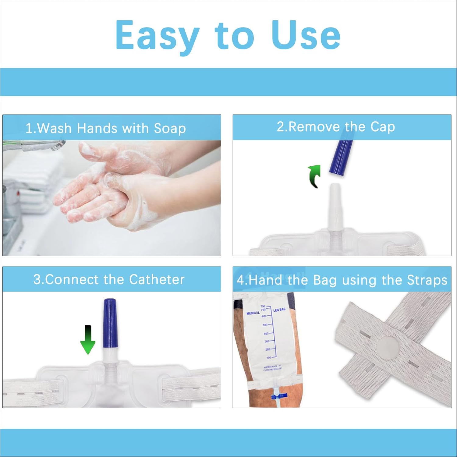 Multipurpose Leg Bag】Drainage bag capacity is 750ml. Ideal for non-ambulatory individuals, hospitalized patients and those who require incontinence care. The leg bag consists of 2 straps, which can fix the leg bag on the leg.
