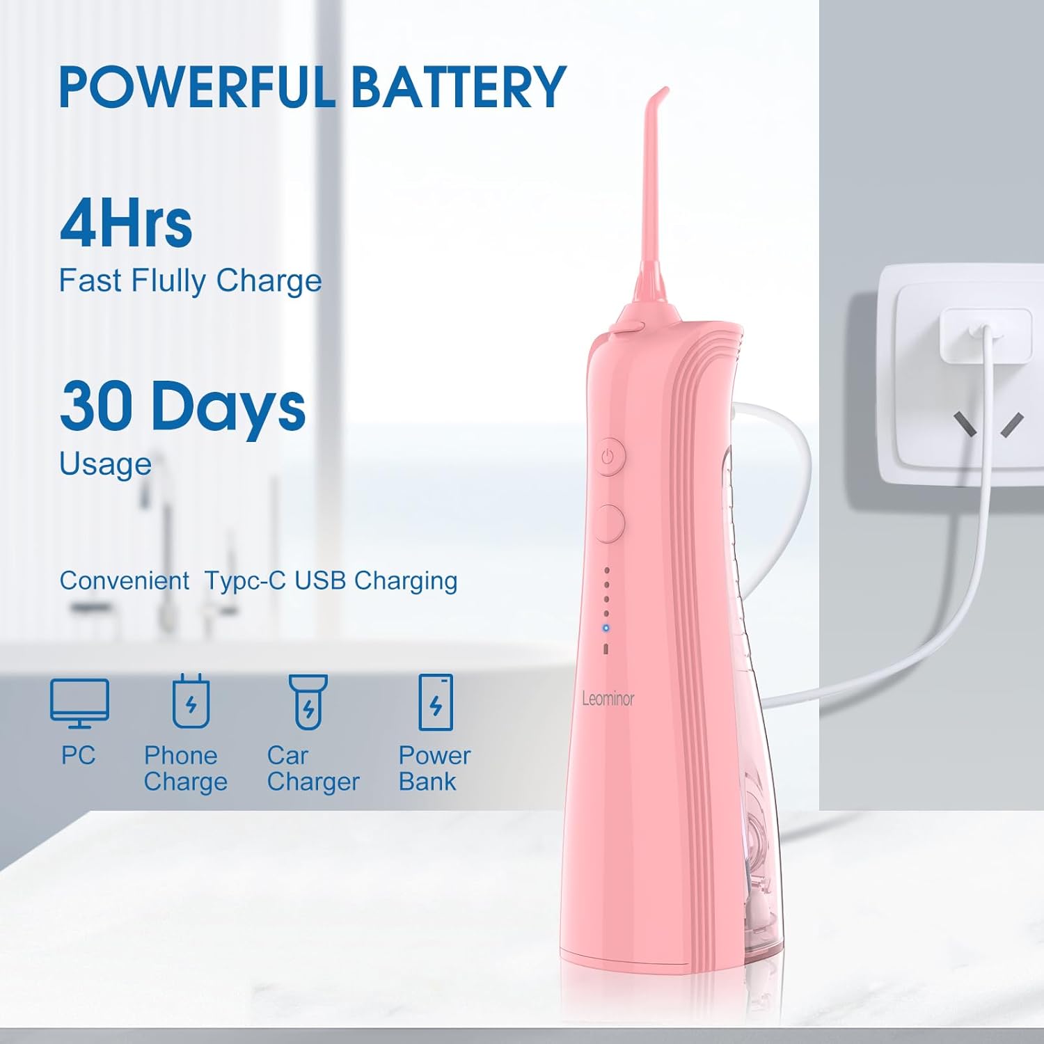 【Portable & Long Battery Life】 With portable size and light weight, Leominor dental flosser brings great convenience to your travels. Adopting 2000Mah Lithium Battery with more Sufficient Power, it is able to be Used Continuously for 15-30 Days with 4-5 hours fully charge. No Hassle to Charge Frequently.