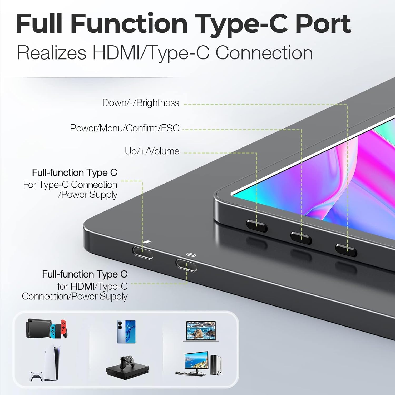 Lepow portable monitor with two full-function Type C ports. The upper one supports Type-C connection/power supply, and the lower one supports HDMI connection/Type-C connection/power supply, which allows you to connect the portable monitor with all kinds of devices, like a phone, PC, laptop, or gaming consoles. The one full functional port solution will make your work more effective.