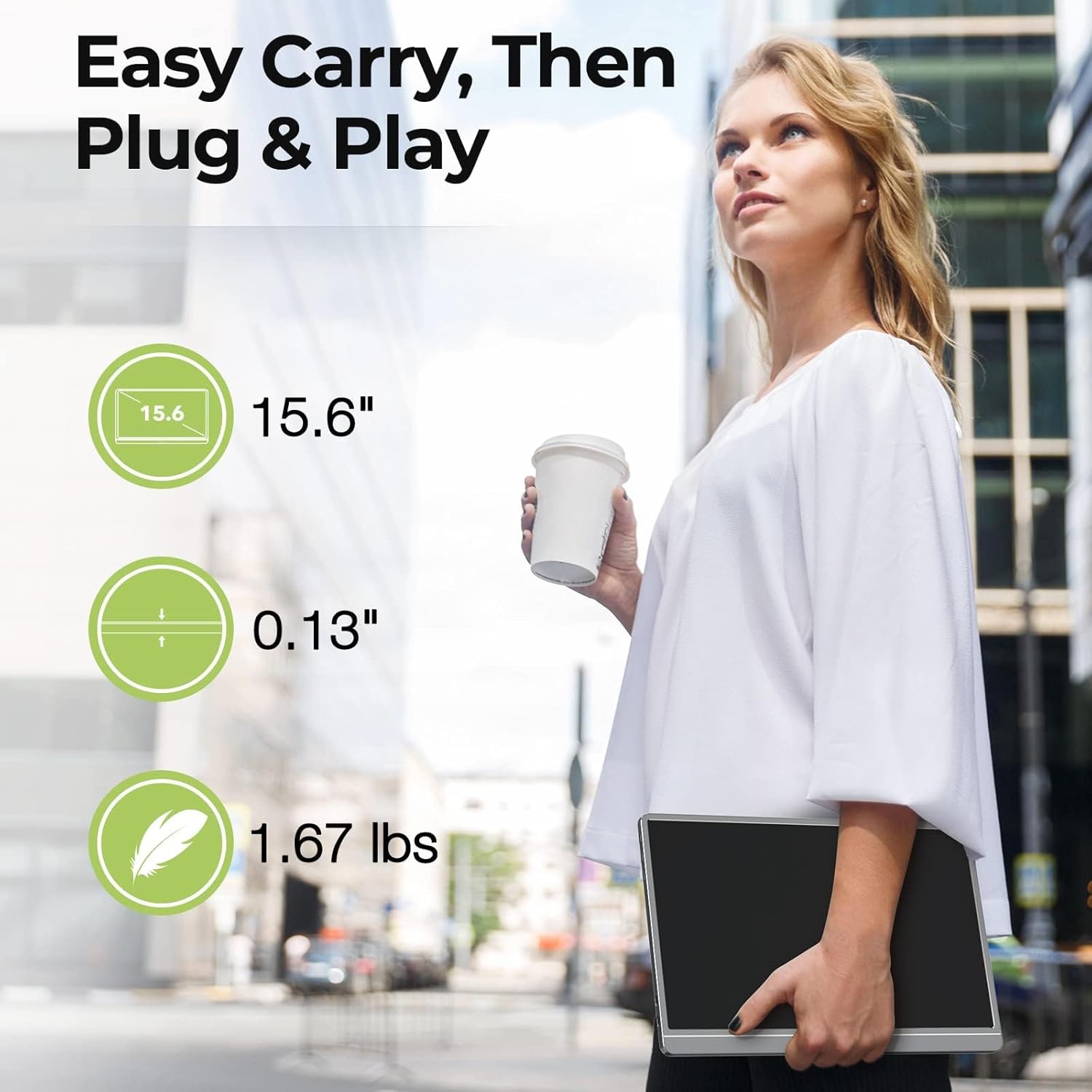 Our portable monitor for laptops features a 0.13″ ultra-slim profile and 1.67lbs lightweight, won’t add weight to your load. The upgraded portability surpasses other competing products, making your portable monitor easier to carry around, just slip it into a backpack, then you can work and play anytime, anywhere on the go.