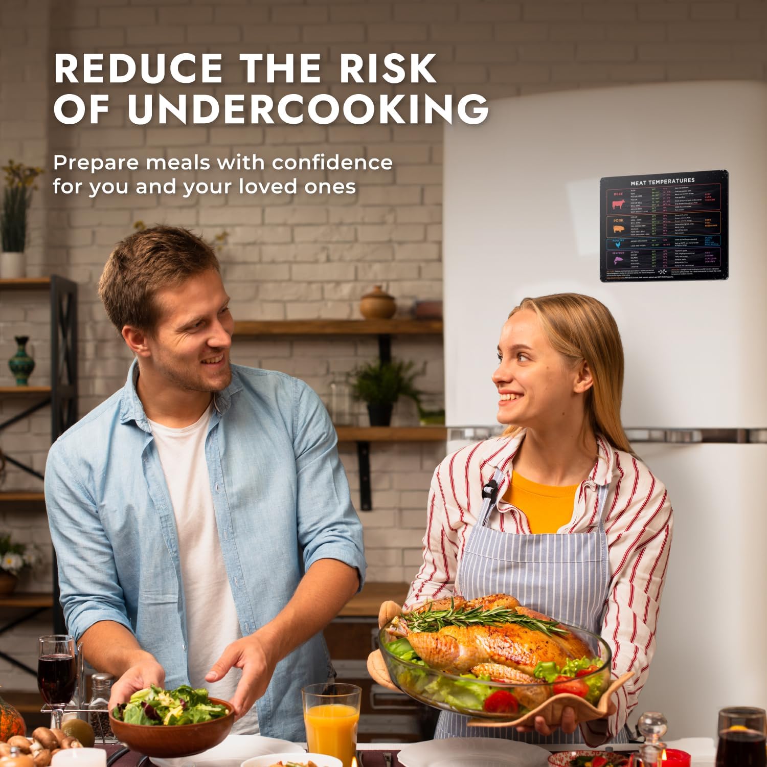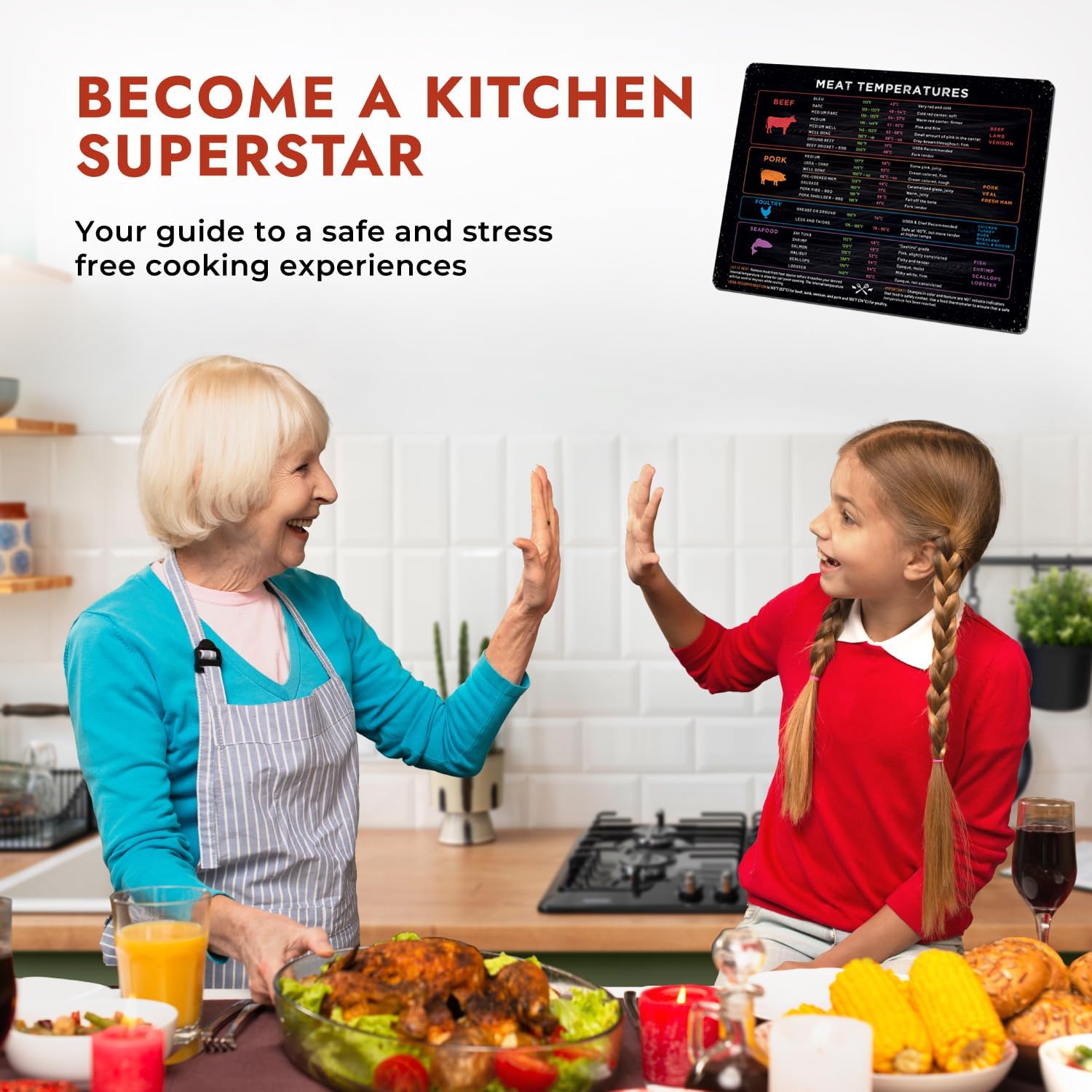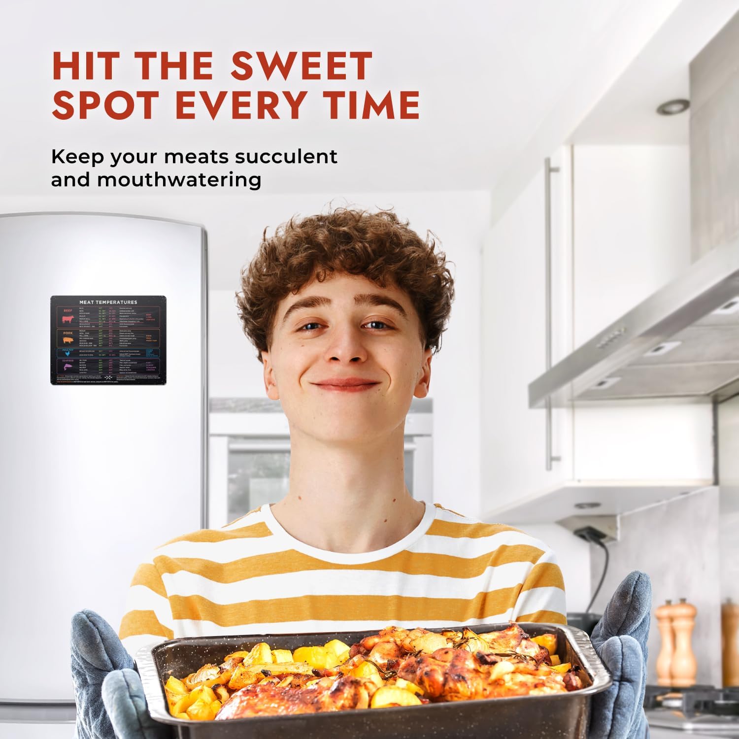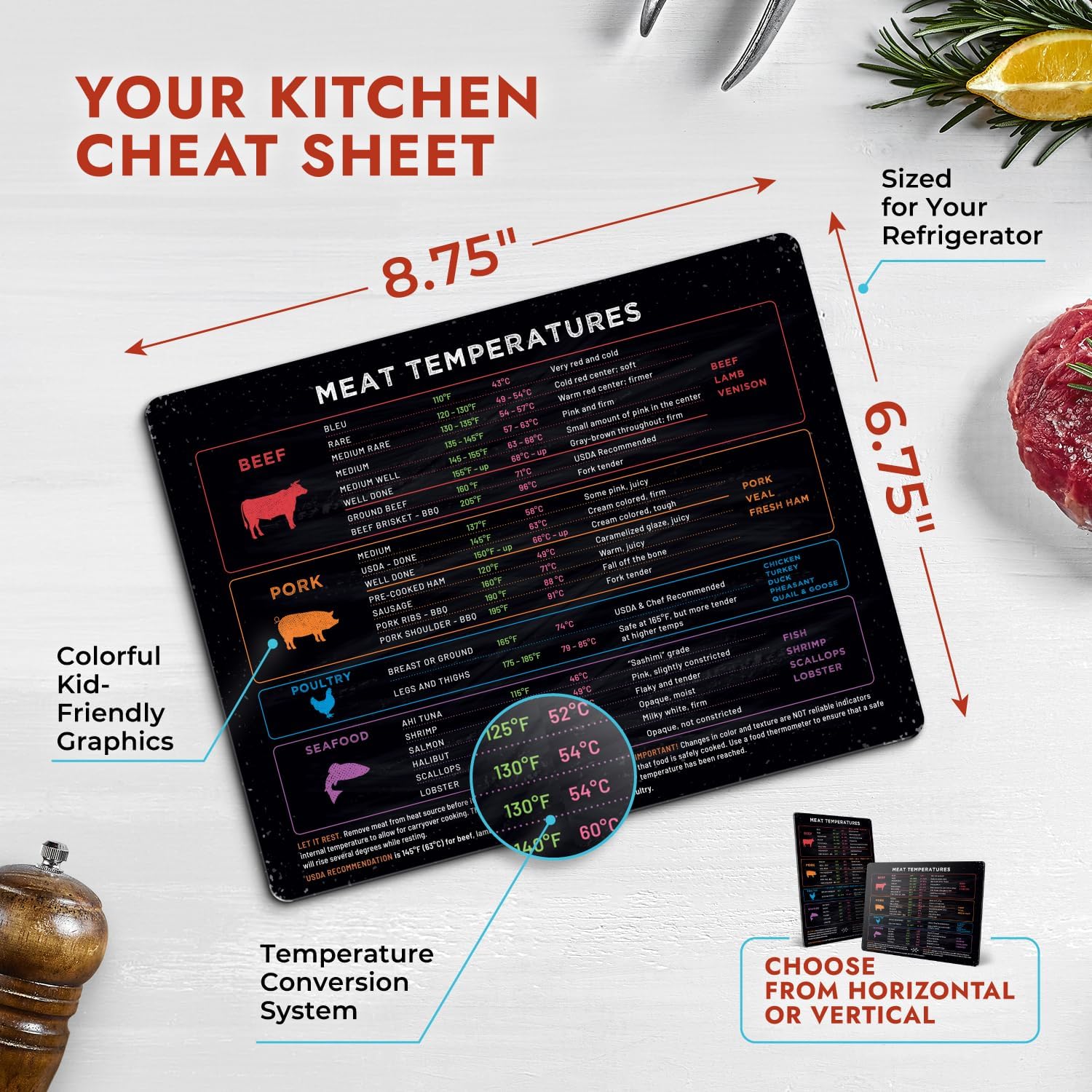 TENDER, JUICY & FLAVORFUL — Cooking is an art, and a great artist needs the right tools. This kitchen gadget works as a pork, poultry, seafood and beef chart for every level of doneness. Eliminate the confusion with temperature conversion refrigerator accessories that convert celsius to fahrenheit. It’s a treasure map to flavor paradise, and it covers all the standard proteins