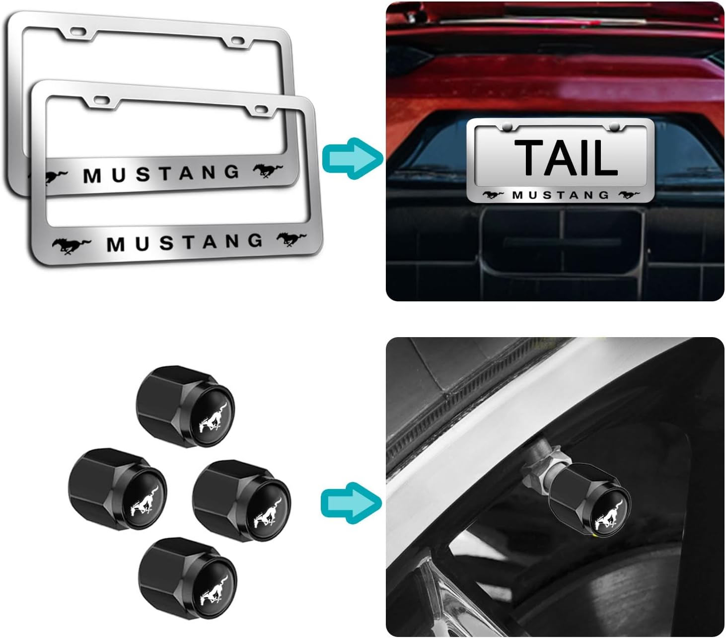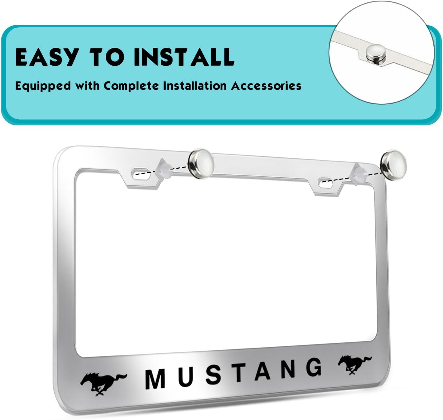 License Plate Frames for Mustang, 2Pack Stainless Steel License Plate Cover Standard License Plate Holder with Screw Caps Set Car Accessories(Silver)