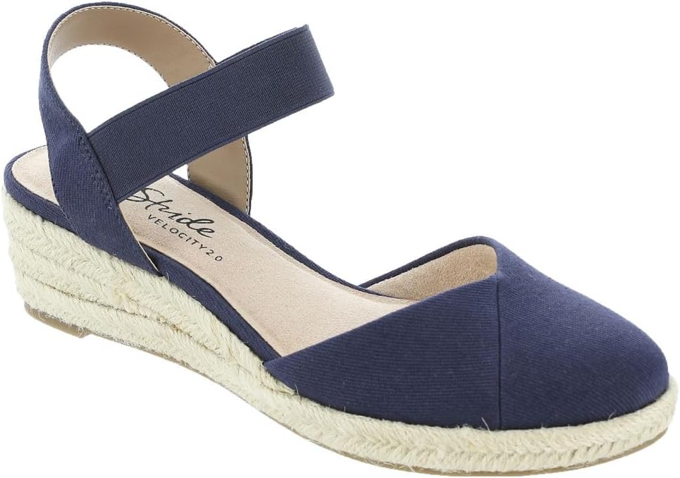 Subtle stripes on the elastic ankle strap give a nautical feel to these ultra comfortable knit womens sandals. Fabric upper with soft stretch gore strap at the ankle, almond toe, slip-on fit, and espadrille-wrapped wedge. Linings, toe box, and heel counter partially crafted with recycled materials. Soft System® comfort package provides all-day support, flex, and cushioning. Get next-level comfort with Velocity 2.0®, featuring luxe linings, superior cushioning, and a premium insole with shock absorption & pressure distribution. Traction sole provides you with extra stability. Just Right Height 1.75 inch espadrille wedge heel.
